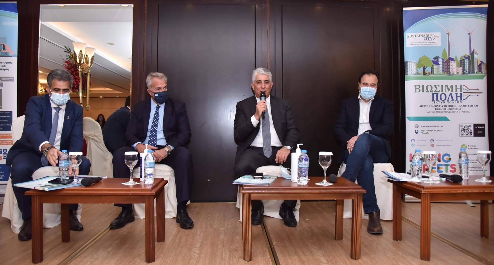 Η έναρξη του Συνεδρίου έγινε από τον Πρόεδρο του Δικτύου και Γενικό Γραμματέα της ΚΕΔΕ, κ. Δημήτριο Καφαντάρη, ο οποίος καλωσόρισε τους προσκεκλημένους και, μεταξύ άλλων, τόνισε το σημαντικό ρόλο που διαδραματίζει η ΒΙΩΣΙΜΗ ΠΟΛΗ στην προσπάθεια των Δήμων να ξεπεράσουν τα εμπόδια που αντιμετωπίζουν στην υλοποίηση ευρωπαϊκών προγραμμάτων και έργων. Ο Πρόεδρος εξήγησε πως αυτή η προσπάθεια είναι περισσότερο αποδοτική και αποφέρει τα επιθυμητά αποτελέσματα, όταν οι Δήμοι συνεργάζονται μεταξύ τους και δημιουργούν δίκτυα, τα οποία εξυπηρετούν τους στόχους τους σε πεδία που επιδέχονται περαιτέρω ανάπτυξη, όπως στην προκειμένη περίπτωση η Βιώσιμη Ανάπτυξη, η Κυκλική Οικονομία και η Αειφορία.