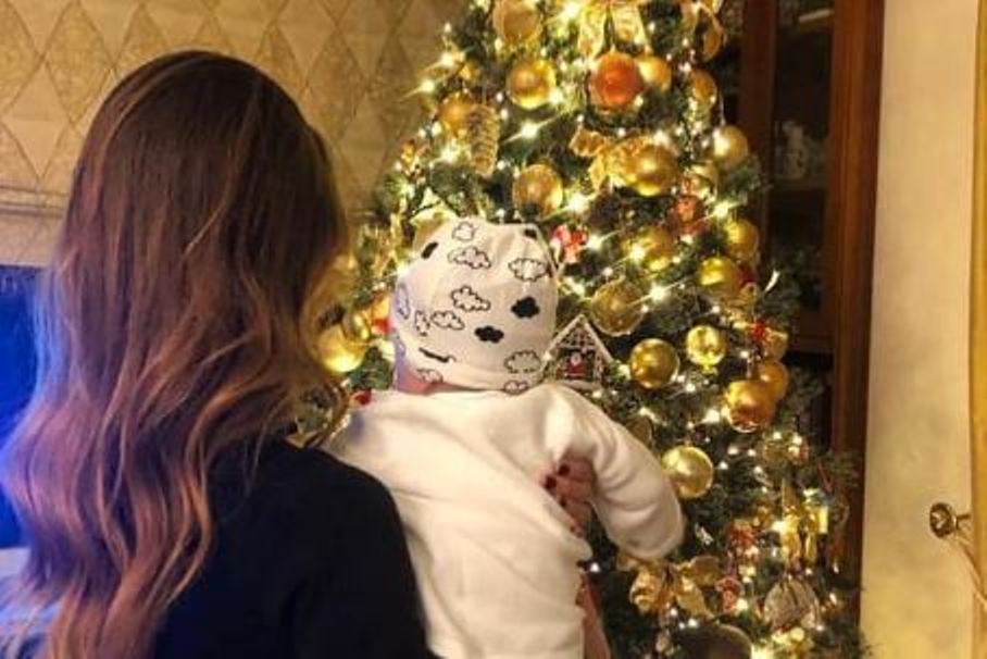 Με τον μικρό της στην αγκαλιά της, ο οποίος φορά ένα σκουφάκι, η πρώην υπουργός στέκεται μπροστά στο δέντρο και στέλνει τις ευχές.