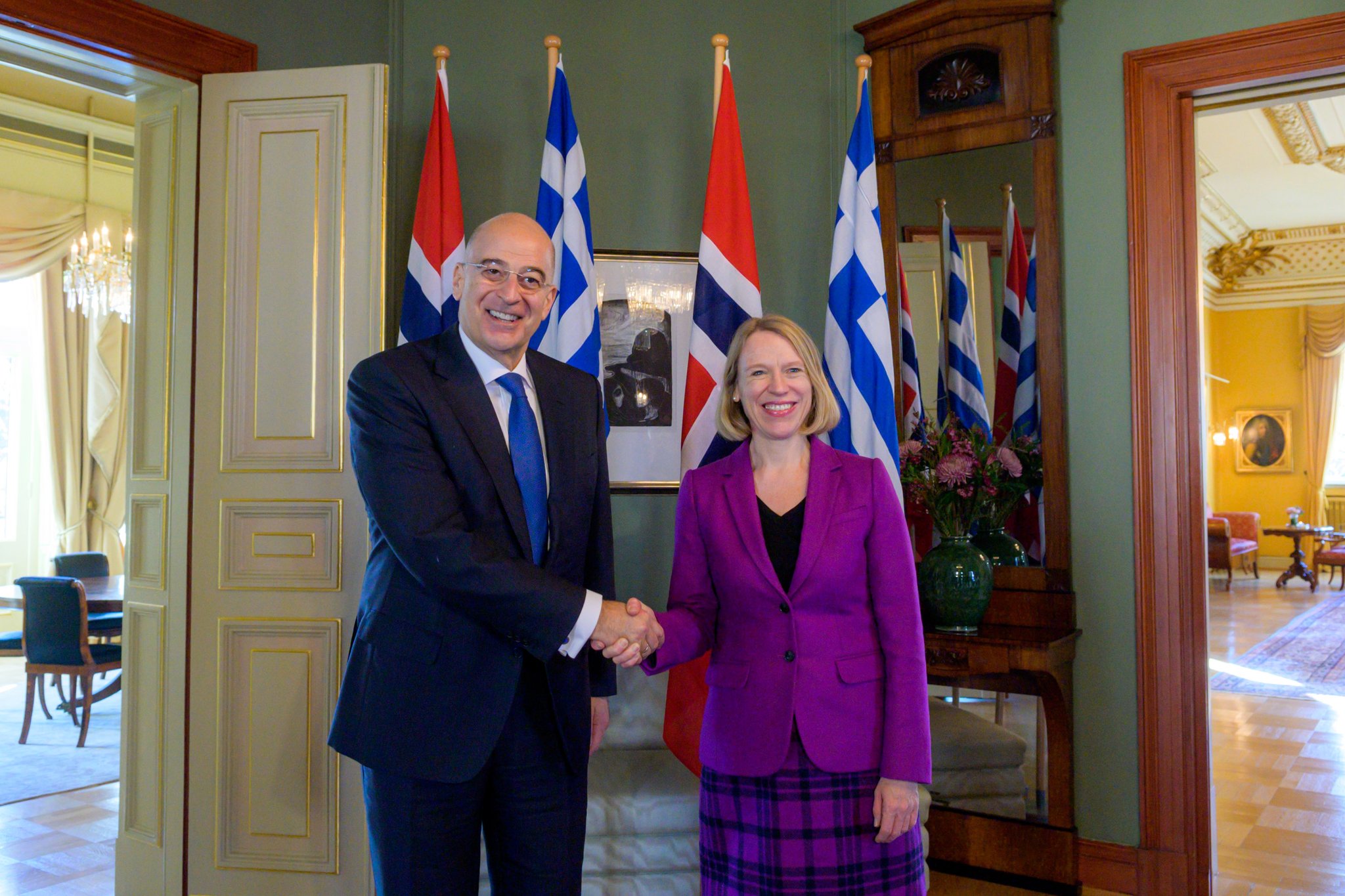 Ι was welcomed by #Norway FM @AHuitfeldt. Discussion on advancing 🇬🇷🇳🇴 relations in areas of common interest, including investments, shipping & green energy, cooperation within international organizations & #UNCLOS, developments in Eastern Europe & #EasternMediterranean. pic.twitter.com/DlGfmYrREt