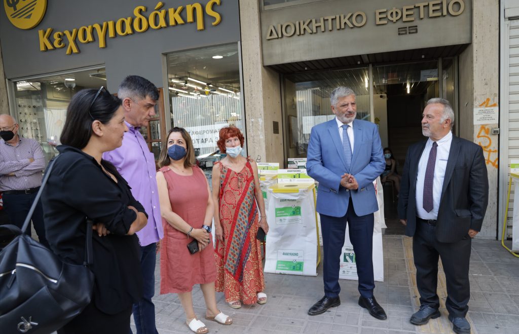 Τους ειδικούς κάδους εσωτερικής ανακύκλωσης και χωριστής συλλογής πλαστικών, μεταλλικών και χάρτινων συσκευασιών διαλογής στην πηγή παρέλαβε ο Πρόεδρος του Διοικητικού Εφετείου Πειραιά Γ. Καφές, συνοδευόμενος από τον Β. Γιάνναρο (Διοικ. Γραμματέα Β/ΠΕ) και την Μ. Μαραγκουδάκη (Διοικ. Γραμματέα). Τον Περιφερειάρχη Αττικής συνόδευσε η Αντιπεριφερειάρχης Πειραιά Στ. Αντωνάκου.
