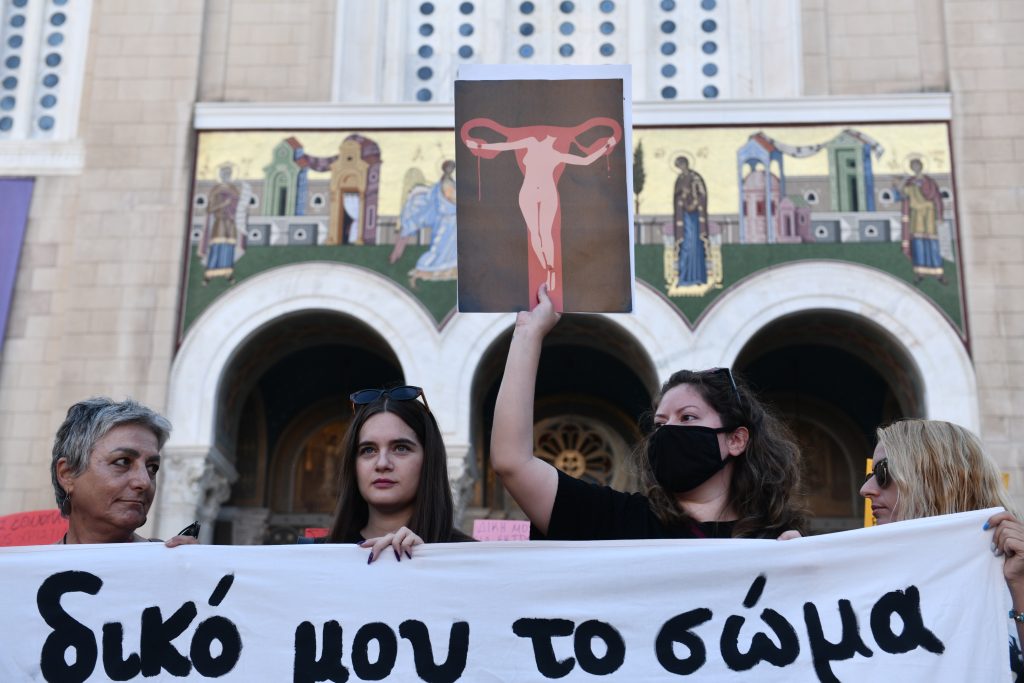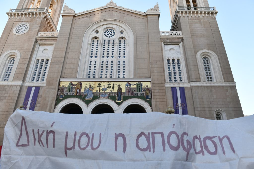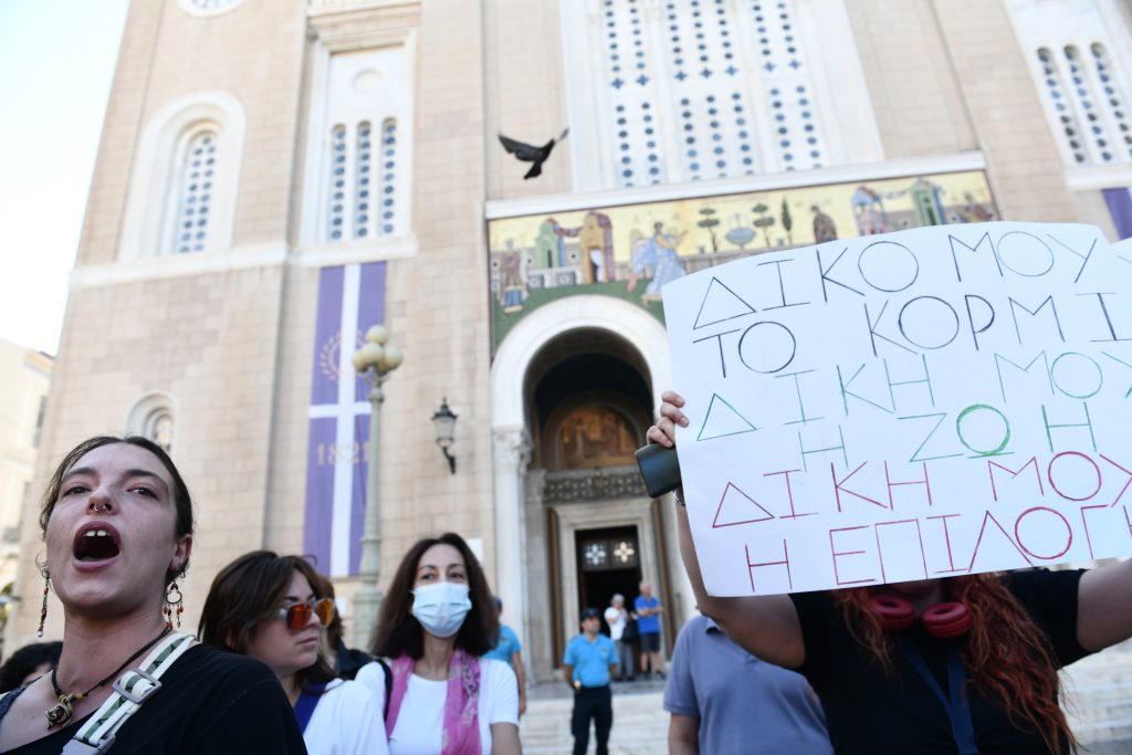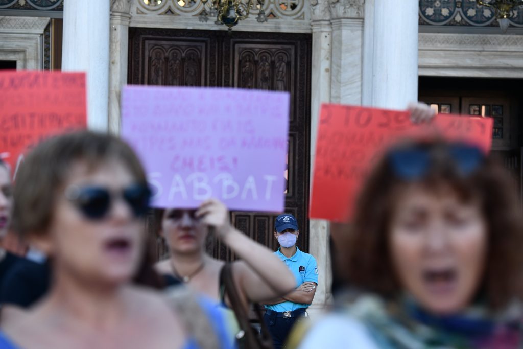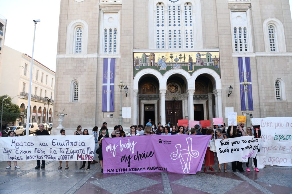 Οι γυναίκες συγκεντρώθηκαν έξω από τη Μητρόπολη από νωρίς το πρωί της Πέμπτης για να εκφράσουν την αντίθεσή τους στην εγκύκλιο κατά των αμβλώσεων υψώνοντας πανό και με συνθήματα.