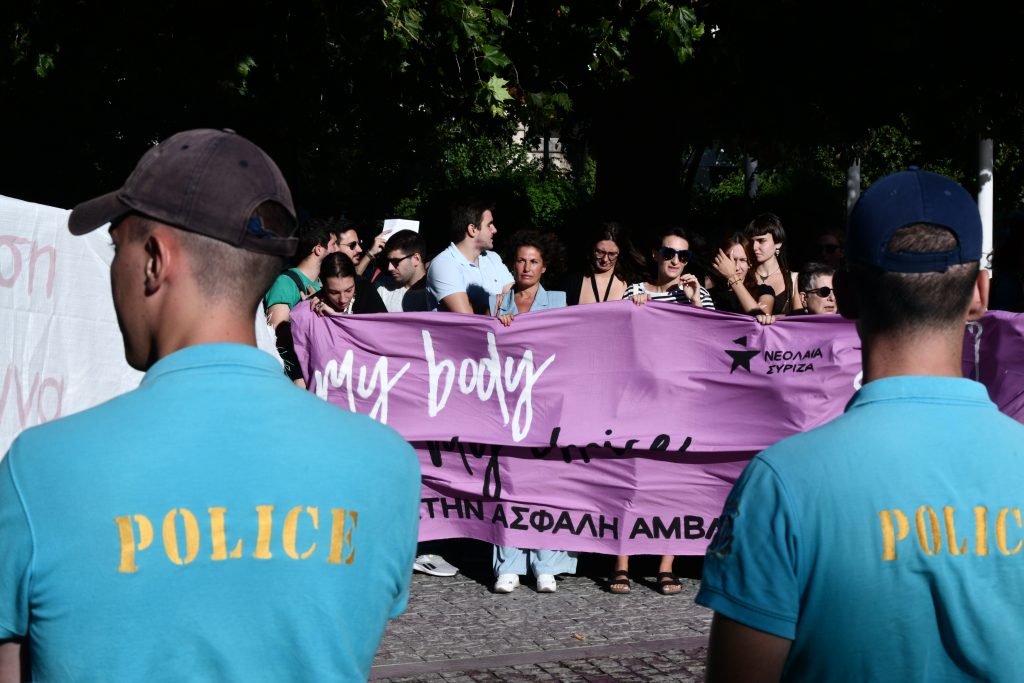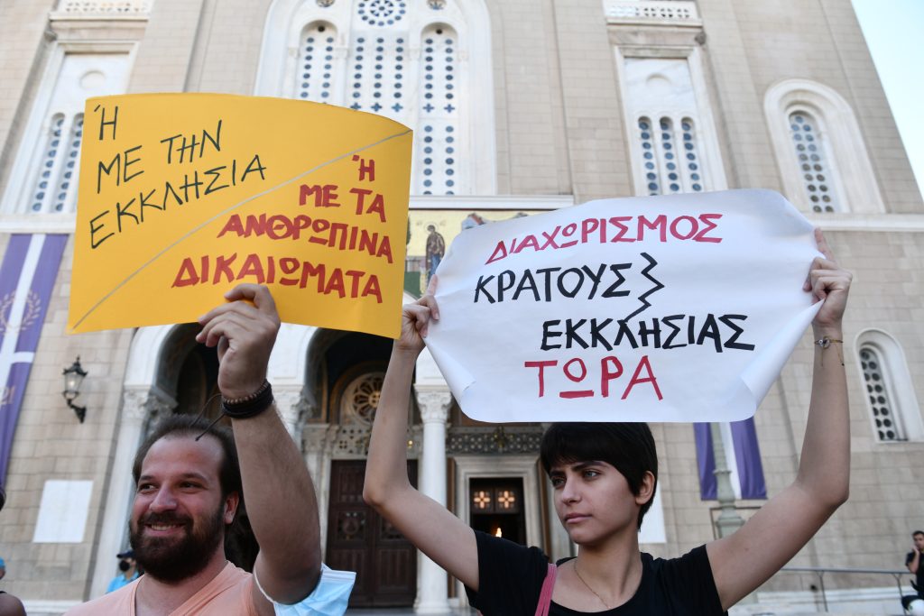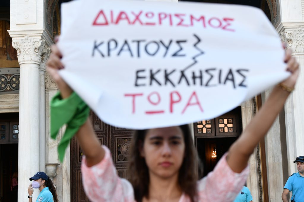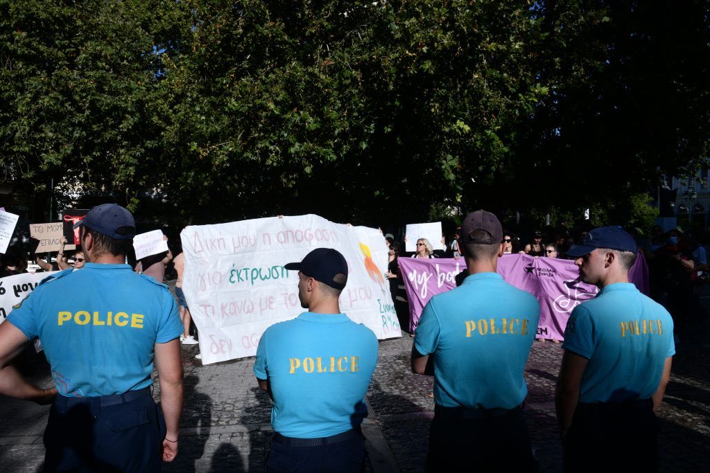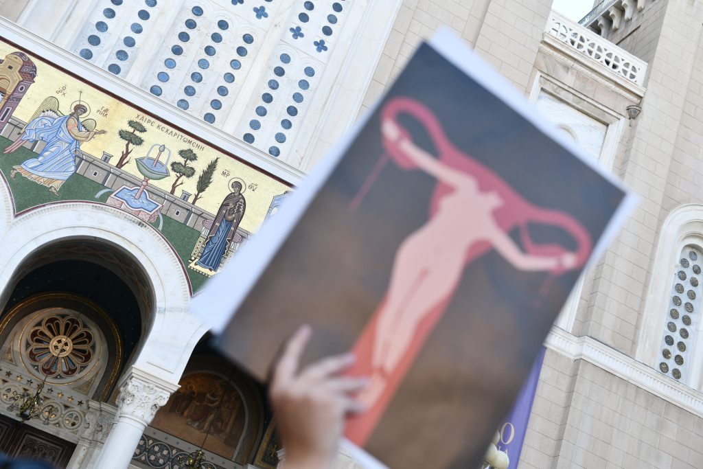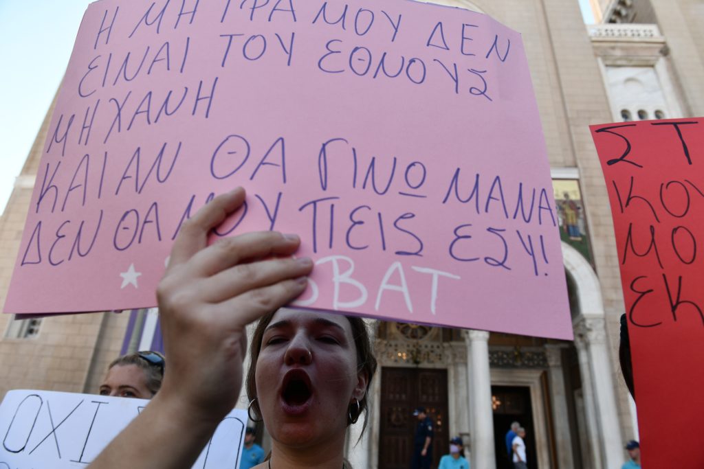 Οι γυναίκες συγκεντρώθηκαν έξω από τη Μητρόπολη από νωρίς το πρωί της Πέμπτης για να εκφράσουν την αντίθεσή τους στην εγκύκλιο κατά των αμβλώσεων υψώνοντας πανό και με συνθήματα.
