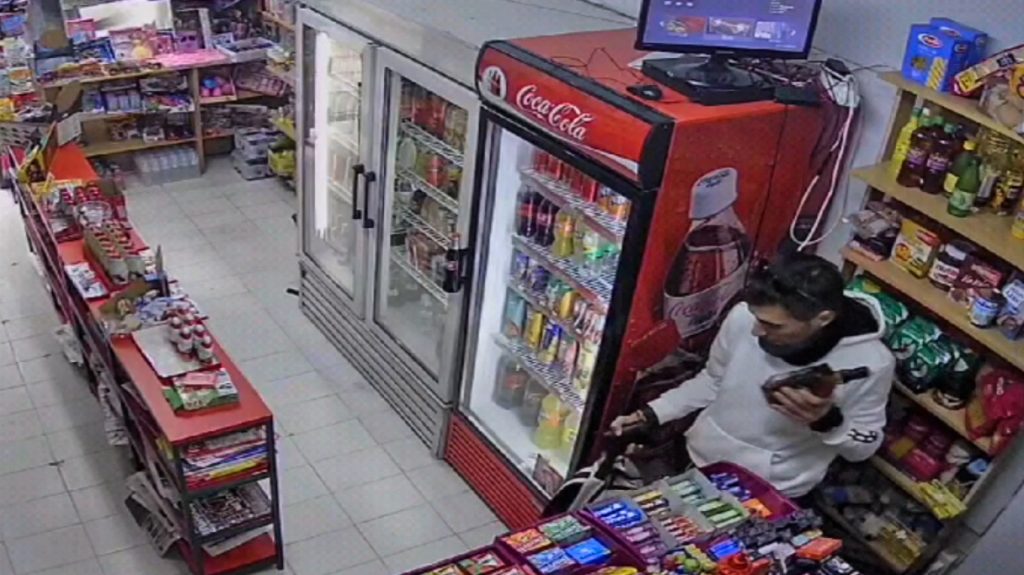 Ελάχιστα δευτερόλεπτα αργότερα, μόλις αντιλαμβάνεται ότι ο εργαζόμενος έχει πάει στον πίσω χώρο της επιχείρησης, μπαίνει ξανά στο κατάστημα ψιλικών. Ελέγχοντας αν τον βλέπει κανείς και αγνοώντας τις κάμερες ασφαλείας που καταγράφουν τις κινήσεις του, κοιτά στην αρχή προς την ταμειακή μηχανή, ωστόσο καταλαβαίνει ότι είναι δύσκολο να φτάσει γρήγορα το συρτάρι για να αποσπάσει τα χρήματα.