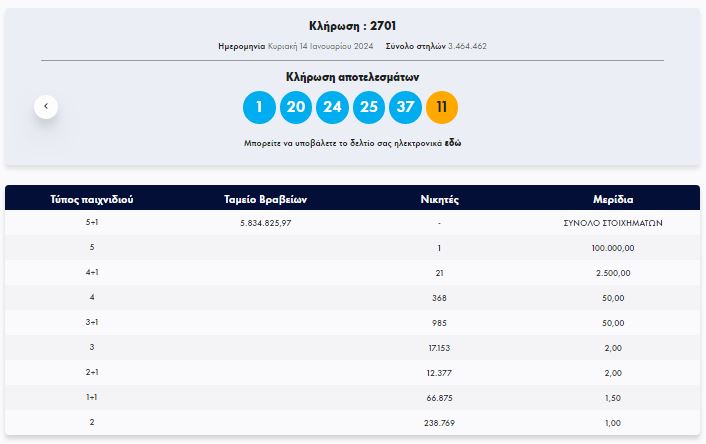 Στην κλήρωση Τζόκερ ΟΠΑΠ, σήμερα Κυριακή 14-01-2024 (αριθμός κλήρωσης 2701), οι τυχεροί αριθμοί ήταν οι: 37, 20, 24, 1, 25 και τζόκερ ο αριθμός 11.