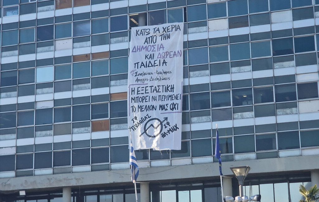 Οι διαδηλωτές, αφού εισέβαλαν στο κτήριο, ανήρτησαν πανό που γράφει «κάτω τα χέρια από τη δημόσια και δωρεάν παιδεία. Η εξεταστική μπορεί να περιμένει, το μέλλον μας όχι».