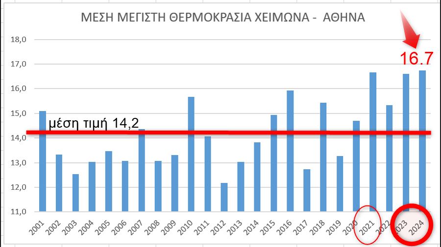 Ενώ η μέση μέγιστη θερμοκρασία του χειμώνα για την Αθήνα είναι 14,2 βαθμοί Κελσίου και για τη Θεσσαλονίκη 10,4 βαθμοί Κελσίου, φέτος η μέση θερμοκρασία θα είναι 16,7 βαθμοί Κελσίου για την Αθήνα και 13,8 βαθμούς Κελσίου για τη Θεσσαλονίκη. Δηλαδή, 2,5 βαθμοί πάνω για την Αθήνα και 3,4 βαθμούς Κελσίου πάνω για τη Θεσσαλονίκη.