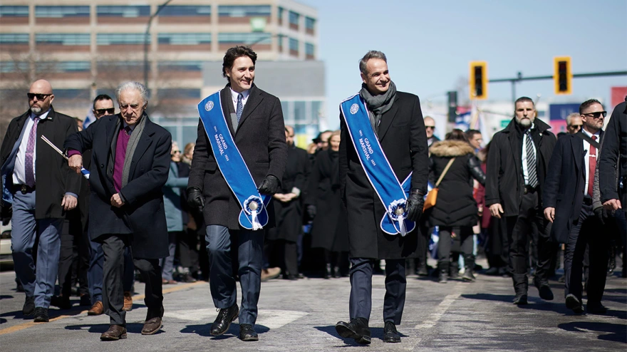 Στο πλαίσιο της επίσημης επίσκεψής του στον Καναδά, ο πρωθυπουργός Κυριάκος Μητσοτάκης, παρακολούθησε την παρέλαση συλλόγων της Ελληνικής Κοινότητας Μείζονος Μόντρεαλ για την εθνική εορτή της 25ης Μαρτίου, μαζί με τον Καναδό ομόλογό του Justin Trudeau.