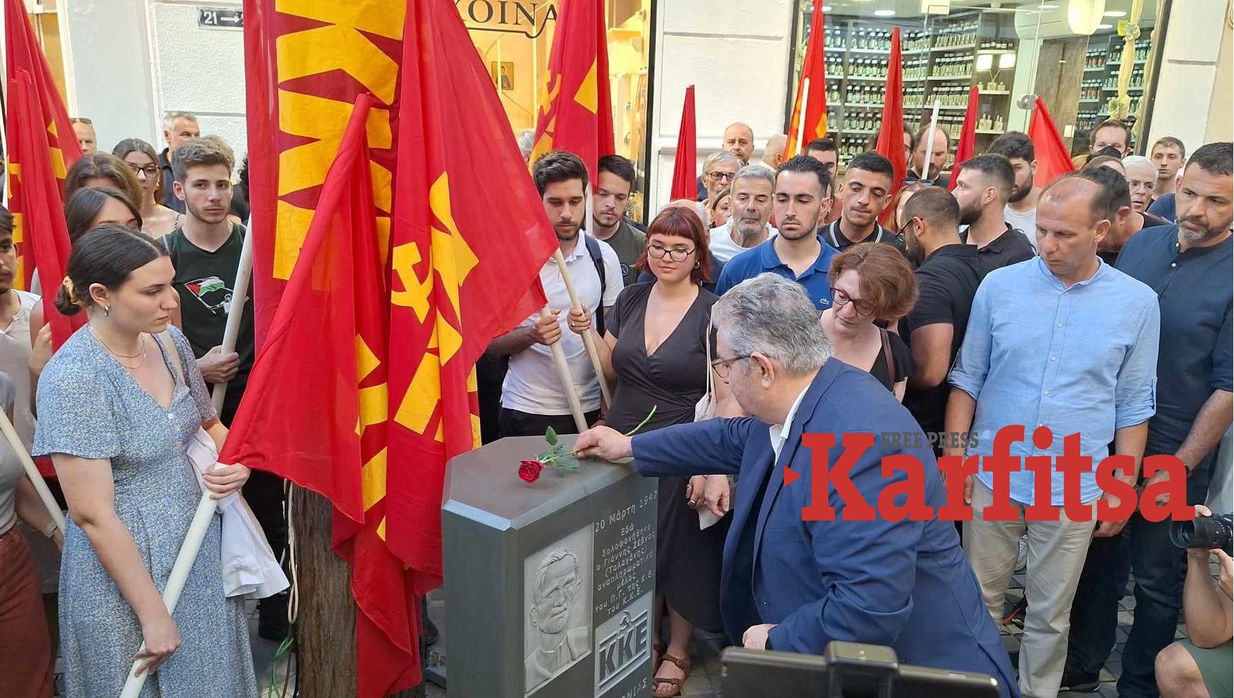 Τα αποκαλυπτήρια του μνημείου του Γιάννη Ζέβγου (Ταλαγάνη), στελέχους του ΚΚΕ που δολοφονήθηκε τον Μάρτιο του 1947, έκανε το απόγευμα της Τρίτης ο γγ της ΚΕ του κόμματος, Δημήτρης Κουτσούμπας στην οδό Αγίας Σοφίας στη Θεσσαλονίκη.