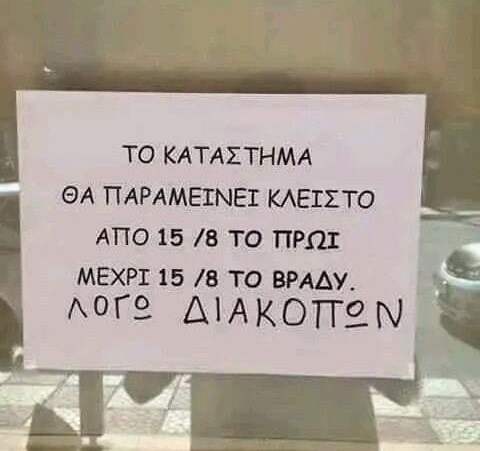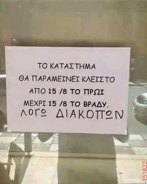 Λοιπόν πριν κοροϊδέψετε -γιατί σας ξέρω- να σας πω ότι τουλάχιστον ο άνθρωπος ενημέρωσε, κάτι που τείνει να γίνει σπάνιο στις μέρες μας. Πας για καφέ κλειστά. Την επόμενη μέρα το ίδιο. Κόλλα άνθρωπέ μου και συ ένα χαρτί να ξέρουμε τι μας γίνεται! Τουλάχιστον εδώ υπάρχει μια υπευθυνότητα που εγώ του το αναγνωρίζω και μπράβο του!