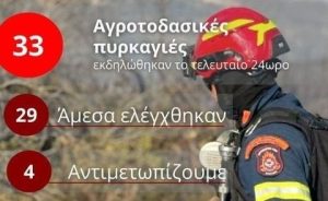 Από αυτές τις 33 φωτιές, οι 29 ελέχθησαν άμεσα ενώ αντιμετωπίζονται (βρίσκονται σε εξέλιξη) άλλες 4.