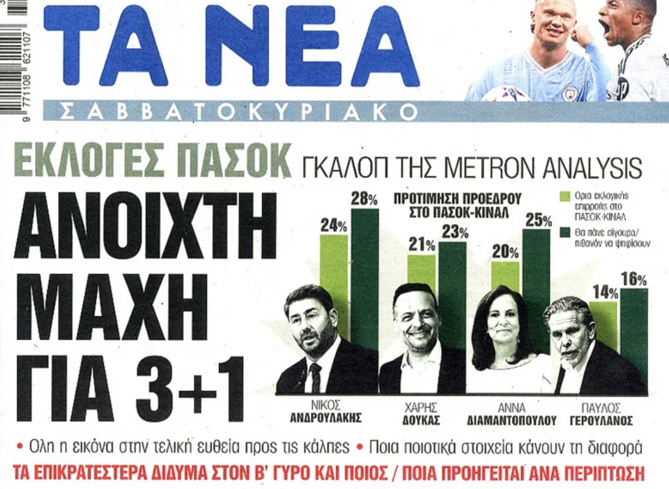 Η εφημερίδα «ΤΑ ΝΕΑ» δημοσίευσε σήμερα, Σάββατο (14/9) δημοσκόπηση της Metron Analysis για τις εσωκομματικές εκλογές στο ΠΑΣΟΚ και τη μάχη των υποψήφιων προέδρων στη Χαριλάου Τρικούπη.