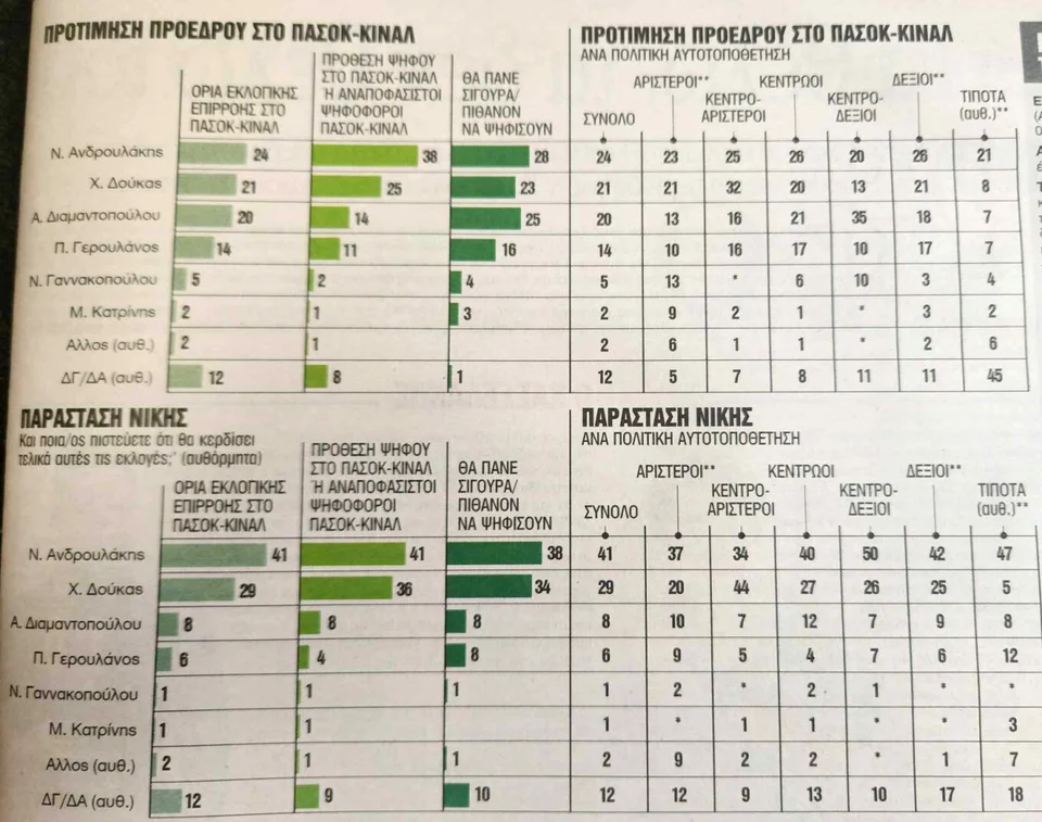 Στην παράσταση νίκης η πρωτιά φαίνεται να ανήκει στον κ. Ανδρουλάκη με τον κ. Δούκα να έρχεται δεύτερος και να κλείνει την ψαλίδα με 38%-34% στους ψηφοφόρους που δηλώνουν πως σίγουρα θα βρεθούν στις κάλπες του Οκτωβρίου, σε ένα ερώτημα στο οποίο Διαμαντοπούλου και Γερουλάνος συγκεντρώνουν μονοψήφια ποσοστά