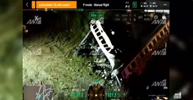 Είναι οι πρώτες ώρες μετά το δυστύχημα. Το drone της πυροσβεστικής πετάει πάνω από τον τόπο της τραγωδίας και καταγράφει καρέ – καρέ εικόνες ασύλληπτης καταστροφής στον τόπο του σιδηροδρομικού δυστυχήματος.