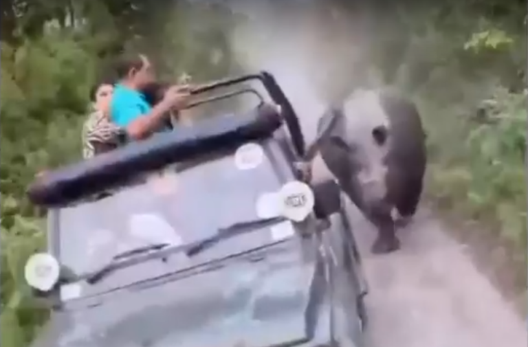 Το συμβάν εκτυλίχθηκε στο Εθνικό Πάρκο Μανάς, όταν ένας εξαγριωμένος ρινόκερος καταδίωξε δύο τζιπ γεμάτα έντρομους επισκέπτες.