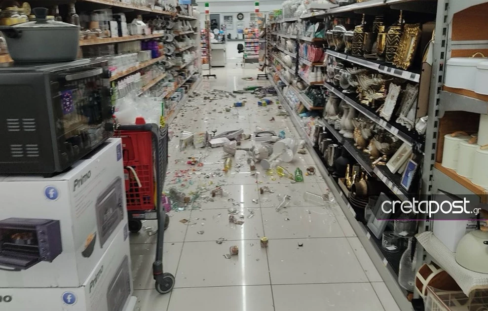 Προϊόντα έπεσαν από τα ράφια των σούπερ μάρκετ, ενώ τμήμα κτιρίου έπεσε στο Ηράκλειο στον πεζόδρομο της 25ης Αυγούστου. Άμεσα στο σημείο βρέθηκαν υπάλληλοι της δημοτικής αστυνομίας που απέκλεισαν τον χώρο ενώ εξετάζονται και άλλες περιοχές.