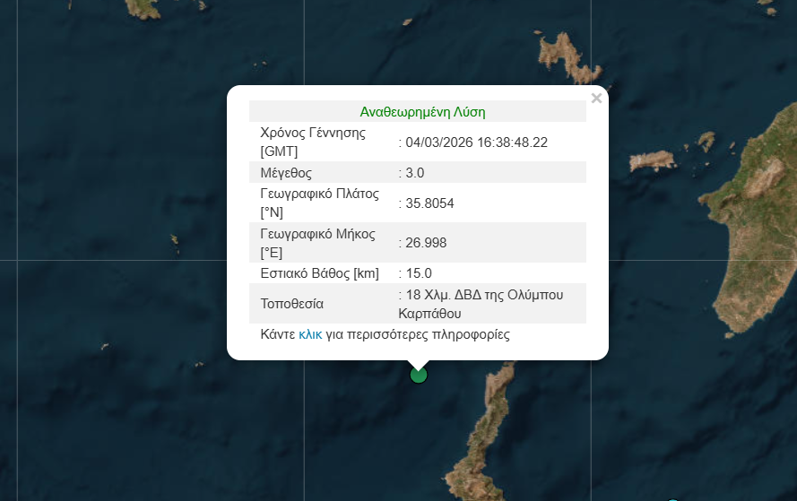 Σεισμική δόνηση μεγέθους 3 Ρίχτερ σημειώθηκε λίγο μετά τις 19:30 το απόγευμα της Τετάρτης (4/3), στα ανοιχτά της Καρπάθου, 18 χιλιόμετρα βορειοδυτικά της Ολύμπου.