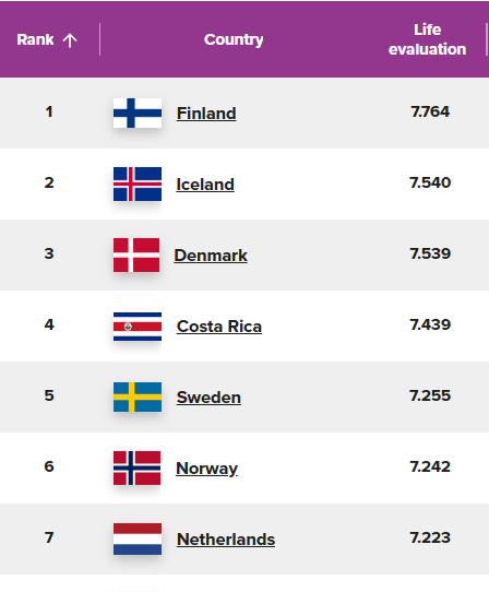 Ξεχωριστή περίπτωση αποτελεί η Κόστα Ρίκα, που ανέβηκε στην τέταρτη θέση, αποδεικνύοντας ότι η ευτυχία δεν εξαρτάται αποκλειστικά από τον πλούτο αλλά από την ισορροπία στον τρόπο ζωής. Στην πρώτη δεκάδα συναντώνται επίσης χώρες όπως η Νορβηγία και η Ολλανδία.