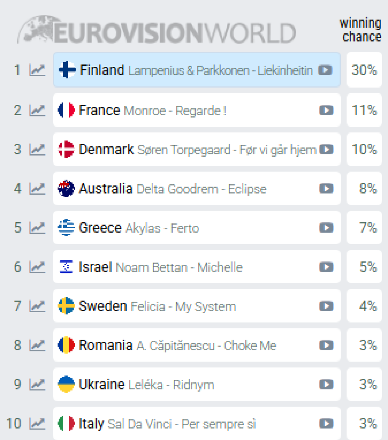 Στην κορυφή των προγνωστικών παραμένει σταθερά η Φινλανδία με το τραγούδι «Liekinheitin», η οποία διατηρεί σαφές προβάδισμα με πιθανότητες νίκης που αγγίζουν το 30%. Τη δεύτερη και τρίτη θέση καταλαμβάνουν η Γαλλία και η Δανία αντίστοιχα, ενώ την τέταρτη θέση έχει πλέον κατακτήσει η Αυστραλία με το «Eclipse».