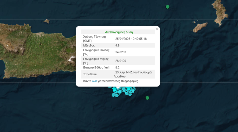 Η νέα σεισμική δόνηση είχε μέγεθος 4,8 Ρίχτερ σύμφωνα με το Γεωδυναμικό Ινστιτούτο, με το επίκεντρο να εντοπίζεται σε θαλάσσια περιοχή, 23 χιλιόμετρα νοτιοδυτικά του Γουδουρά Λασιθίου. Επιπλέον, ο σεισμός ήταν ιδιαίτερα επιφανειακός με το εστιακό βάθος να υπολογίζεται στα 9,2 χιλιόμετρα.