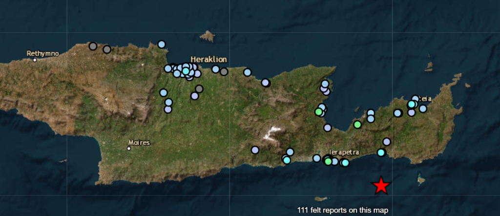 #Earthquake 24 km SE of #Ierápetra (#Greece) 19 min ago (local time 22:49:57). Updated map – Colored dots represent local shaking & damage level reported by eyewitnesses. Share your experience via: