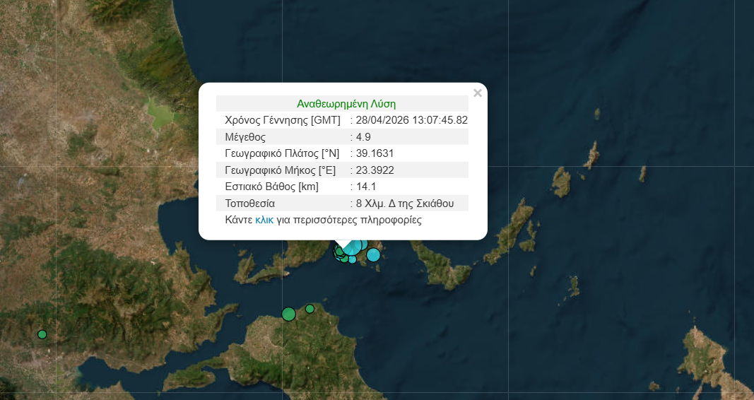 Η νέα δόνηση σημειώθηκε σε περιοχή 4 χιλιόμετρα βορειοδυτικά της χώρας της Σκιάθου, και το εστιακό της βάθος υπολογίζεται στα 10 χιλιόμετρα σύμφωνα με το Γεωδυναμικό Ινστιτούτο.