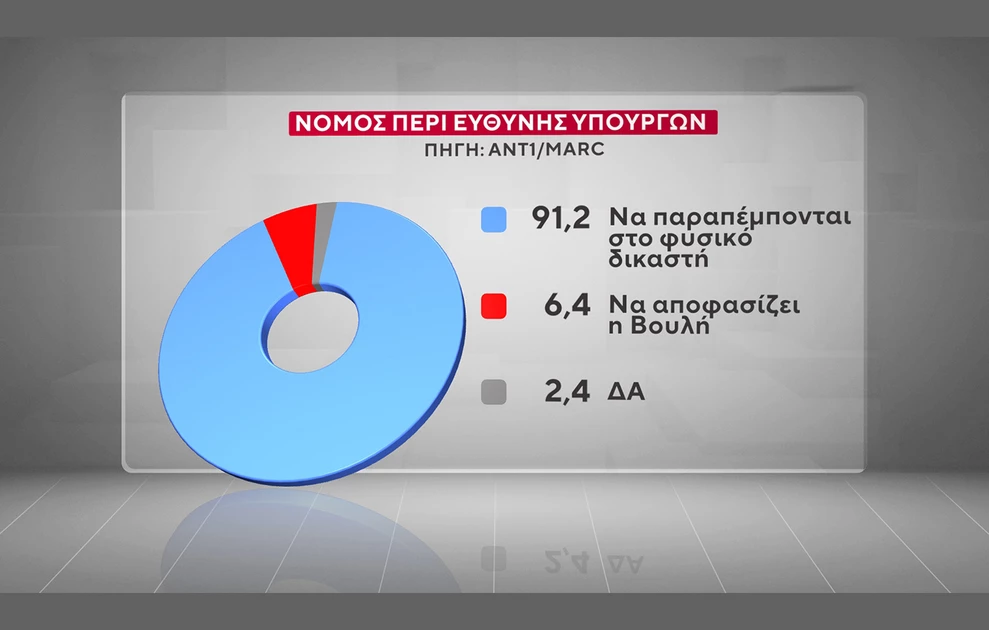 Συντριπτική είναι η πλειοψηφία και υπέρ της κατάργησης του νόμου περί ευθύνης υπουργών, καθώς το 91,2% απαντά πως οι υπουργοί πρέπει «να παραπέμπονται στον φυσικό δικαστή», ενώ μόλις 6,4% λέει πως «πρέπει να αποφασίζει η Βουλή».