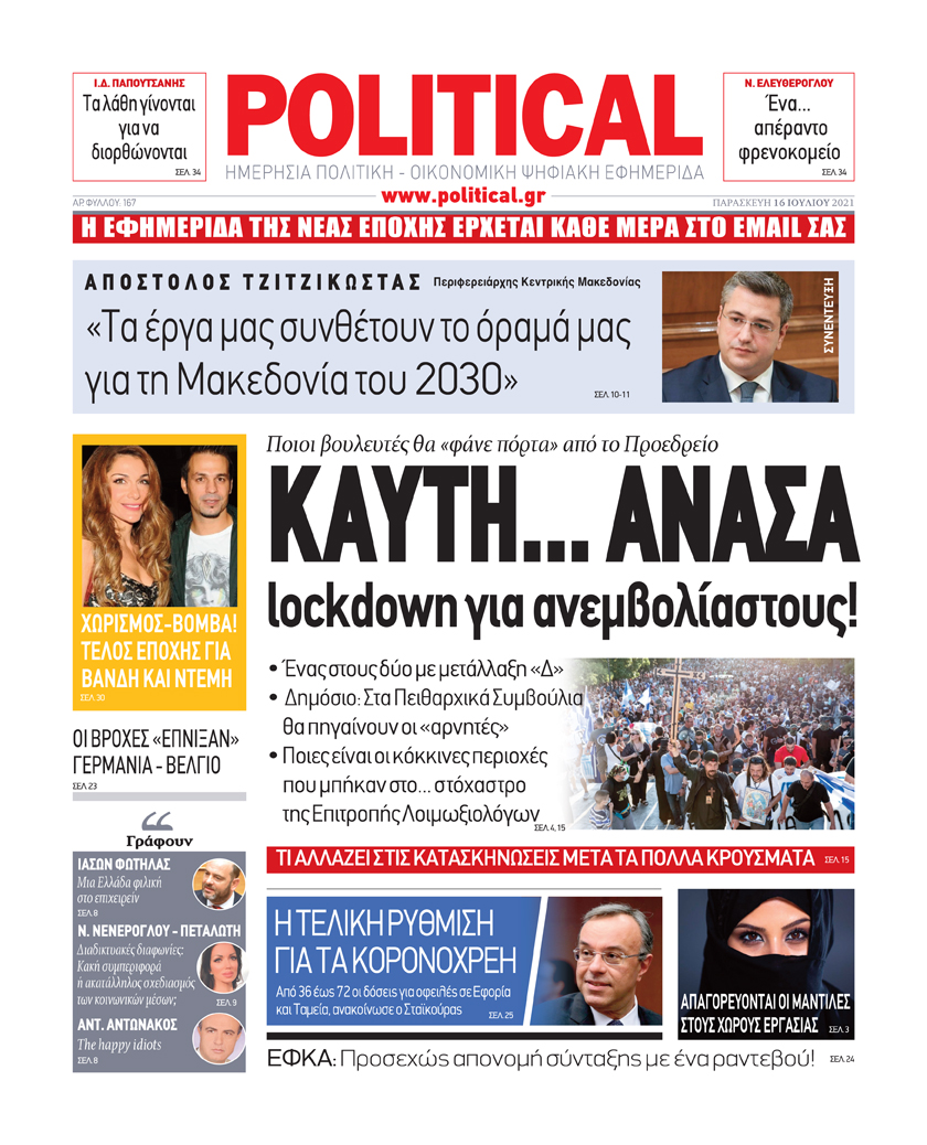 ΚΑΥΤΗ… ΑΝΑΣΑ lockdown για ανεμβολίαστους! – Διαβάστε σήμερα στην εφημερίδα Political