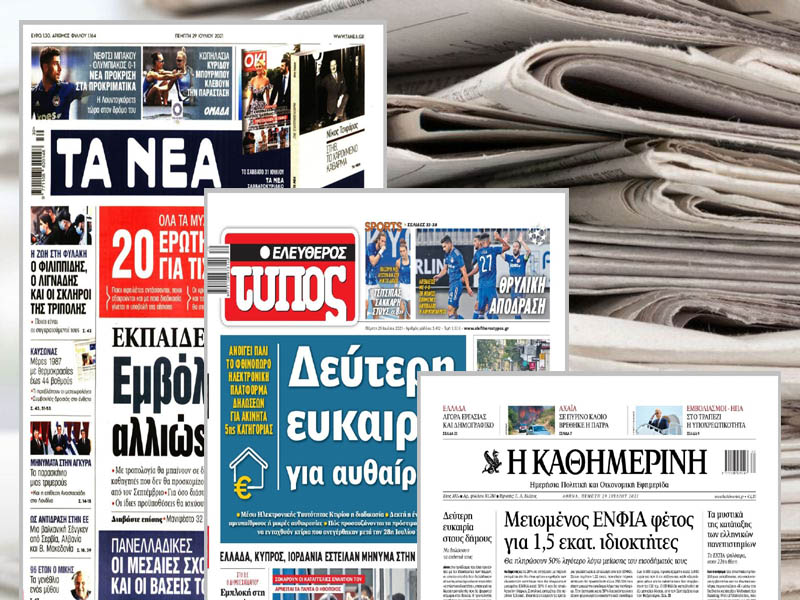 Διαβάστε τα πρωτοσέλιδα των σημερινών εφημερίδων