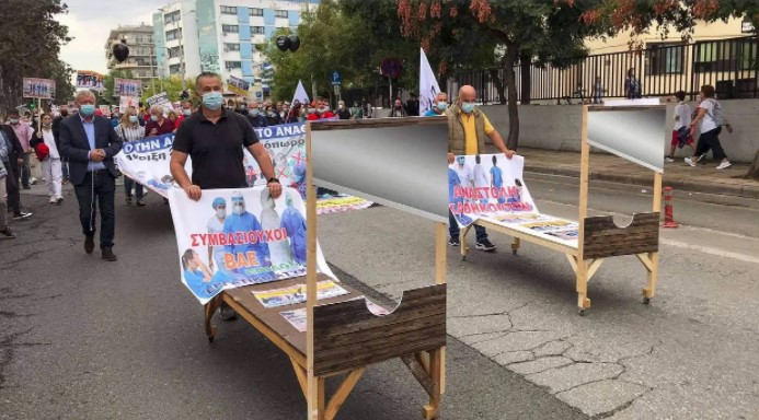 Με αφετηρία το “Ιπποκράτειο” νοσοκομείο οι διαδηλωτές πραγματοποίησαν πορεία με μουσική (υπό τους ήχους του Μίκη Θεοδωράκη), συνθήματα και δρώμενα, σε κεντρικούς δρόμους της Θεσσαλονίκης, καταλήγοντας στο Διοικητήριο (υφυπουργείο Μακεδονίας – Θράκης), όπου άφησαν 27 τριαντάφυλλα στην μνήμη των υγειονομικών που, όπως ανέφεραν, έχασαν τη ζωή τους κατά την περίοδο της πανδημίας, ενώ έβαλαν συμβολικά φωτιά σε αφίσα με τον κορονοϊό.