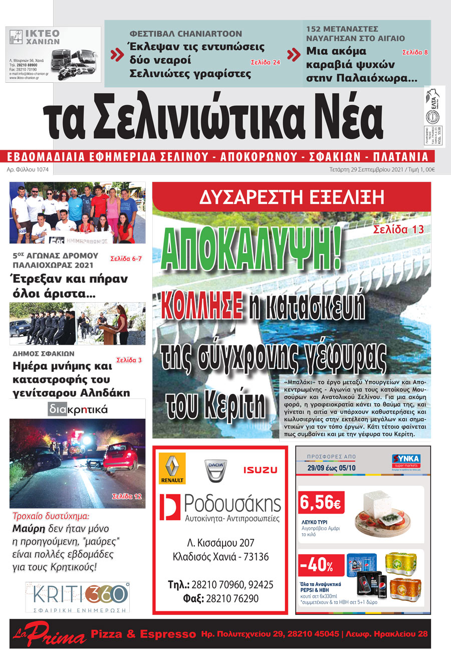 Κοινοποίηση Facebook Twitter LinkedIn Pinterest Email Copy Link Δείτε το πρωτοσέλιδο της εφημερίδας Σελινιώτικα Νέα Σελινιώτικα Νέα
