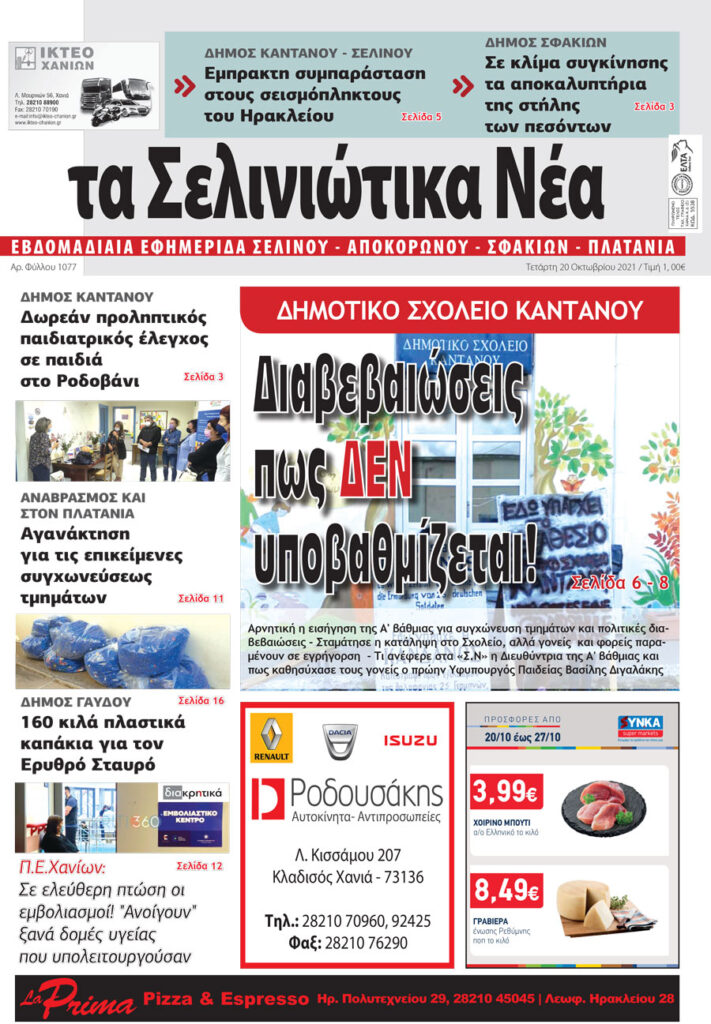 Δείτε το πρωτοσέλιδο του νέου φύλλου της τοπικής εφημερίδας “Σελινιώτικα Νέα”