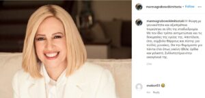 Συλληπητήρια στην οικογένεια της Φώφης Γεννηματά για την μεγάλη απώλεια της έστειλε μέσω Instagram, η σύζυγος του πρωθυπουργόυ, Κυριάκου Μητσοτάκη, Μαρέβα Μητσοτάκη, επισημαίνοντας παράλληλα ότι η εκλιπούσα αποτέλεσε σύμβολο θάρρους και πίστης για πολλές γυναίκες με τον τρόπο που αντιμετώπισε και τις δοκιμασίες της υγείας της.