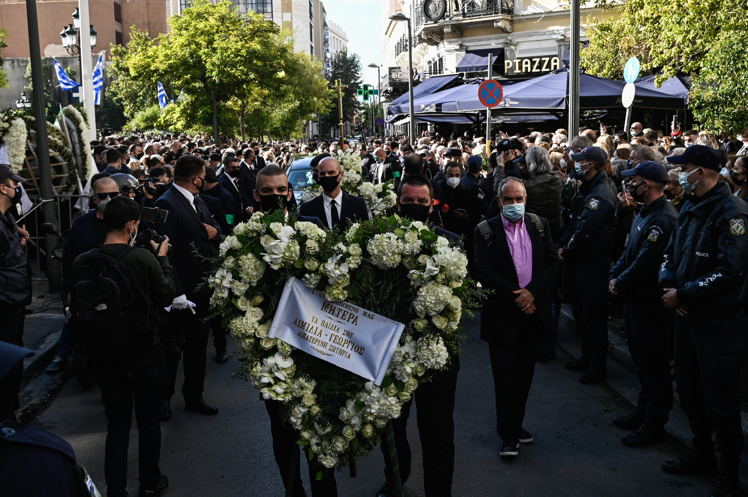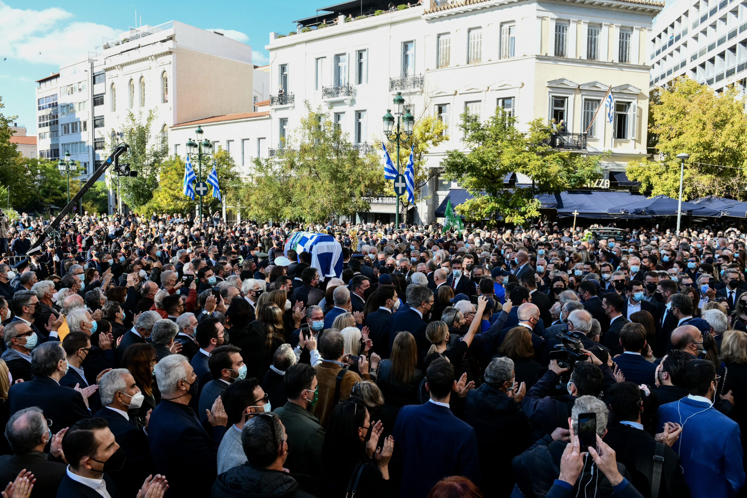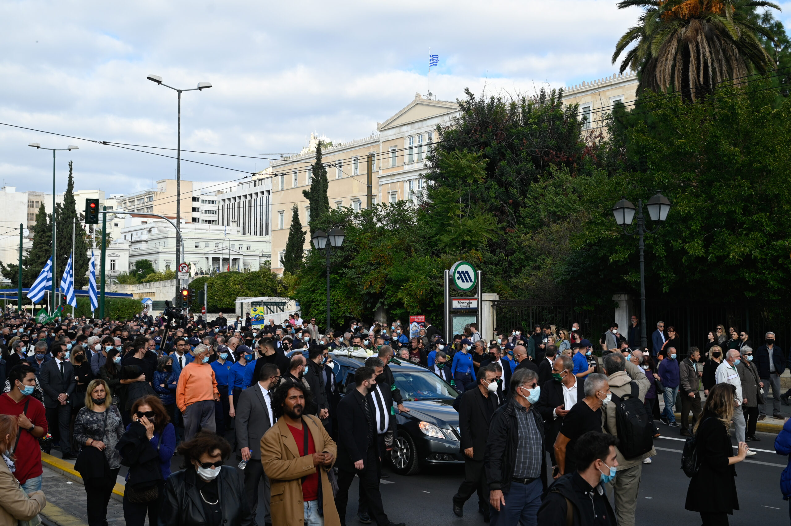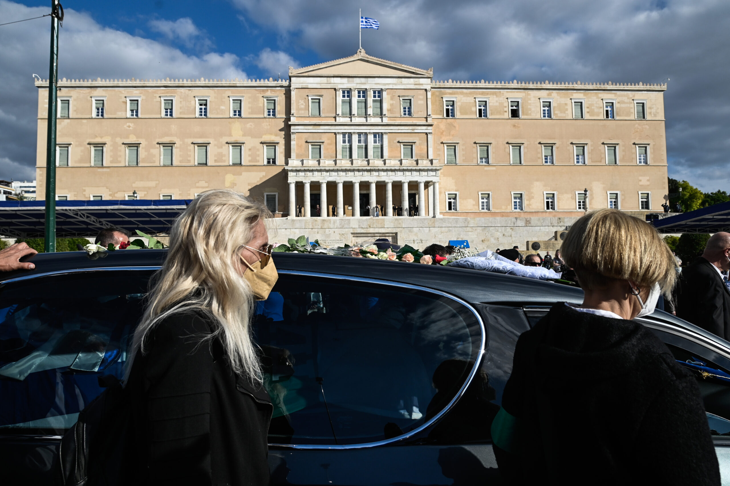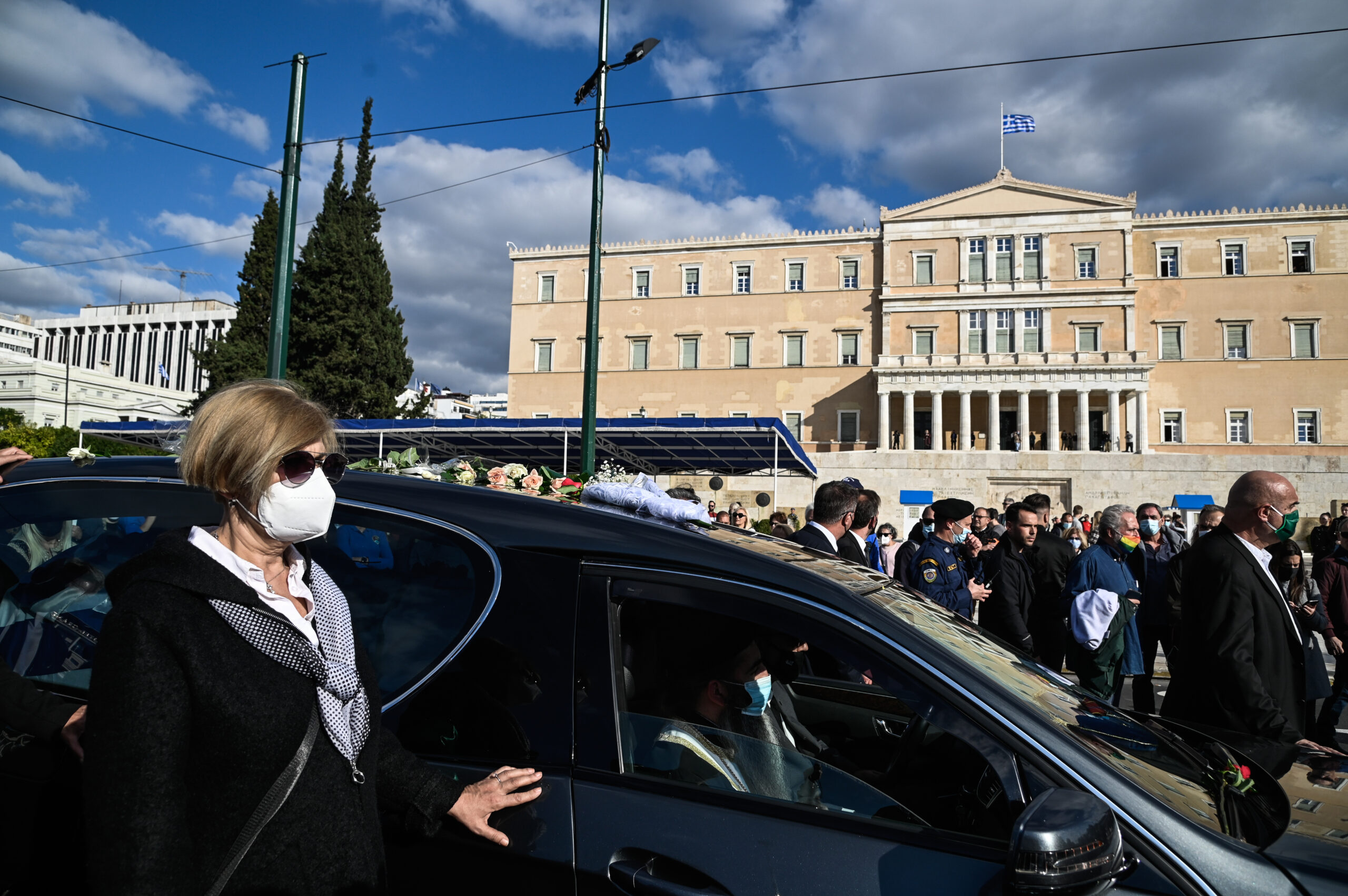 Μπροστά από τη Βουλή, στο μνημείο του Αγνώστου Στρατιώτη, η νεκρώσιμη πομπή πραγματοποίησε ολιγόλεπτη στάση.