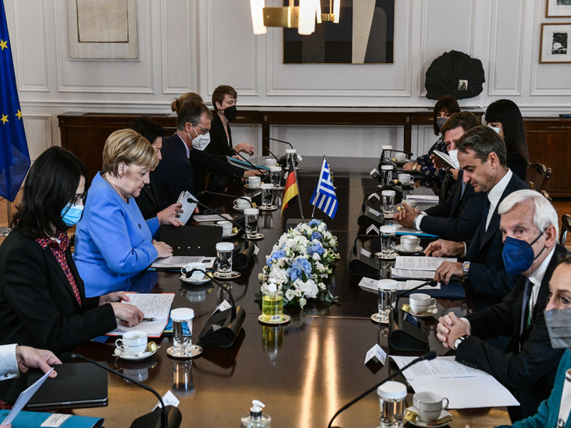 Μετά το Προεδρικό Μέγαρο, όπου έγινε δεκτή από την Πρόεδρο της Δημοκρατίας, Κατερίνα Σακελλαροπούλου, η Άνγκελα Μέρκελ μετέβη στο Μέγαρο Μαξίμου για τη συνάντηση με τον Κυριάκο Μητσοτάκη.