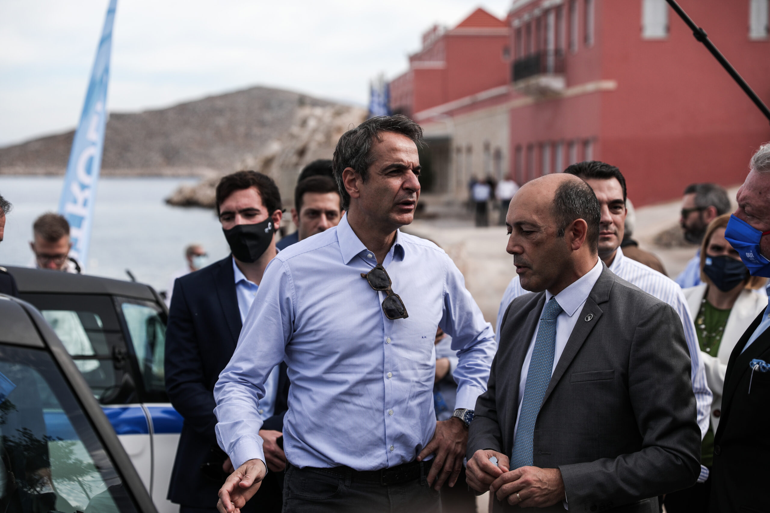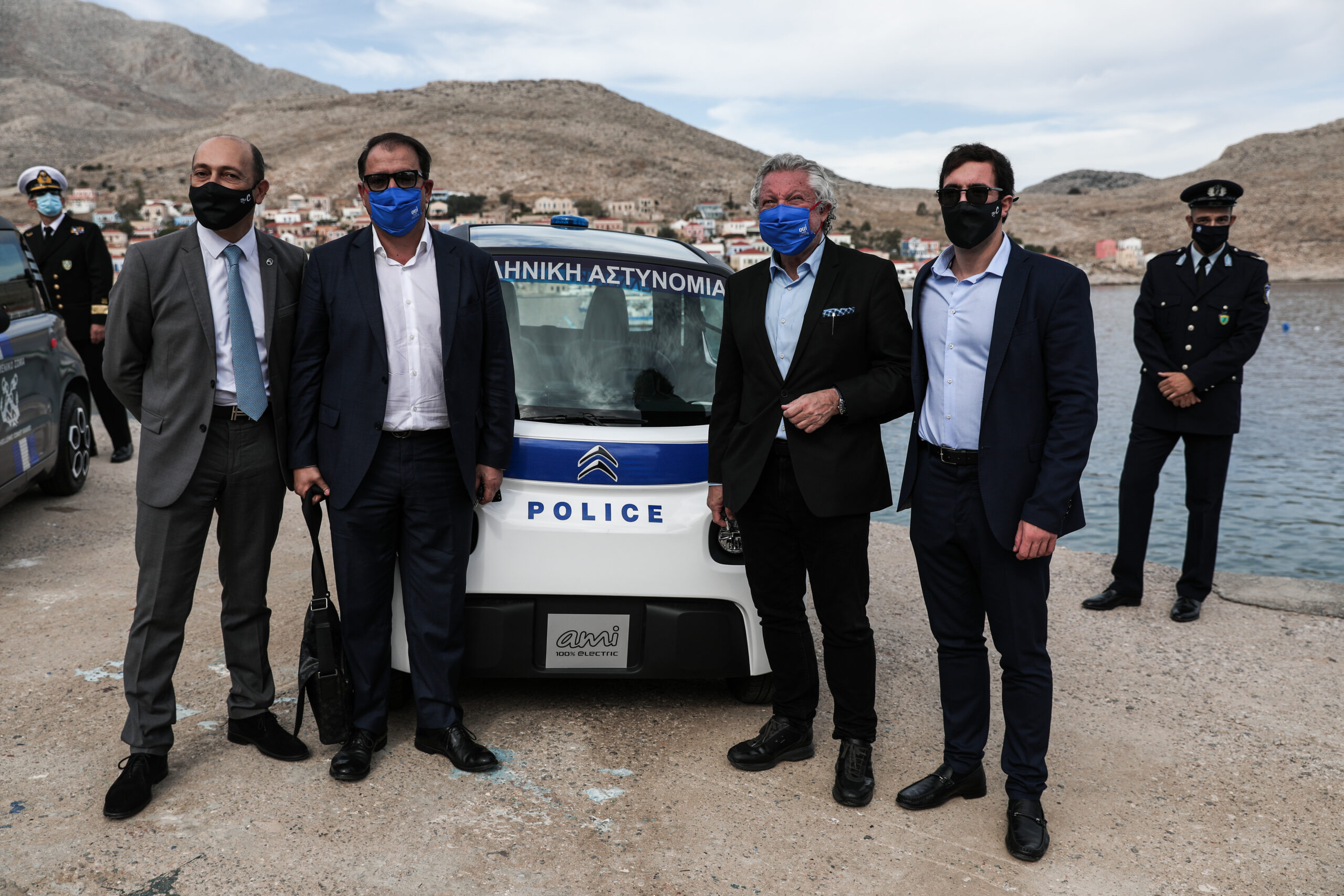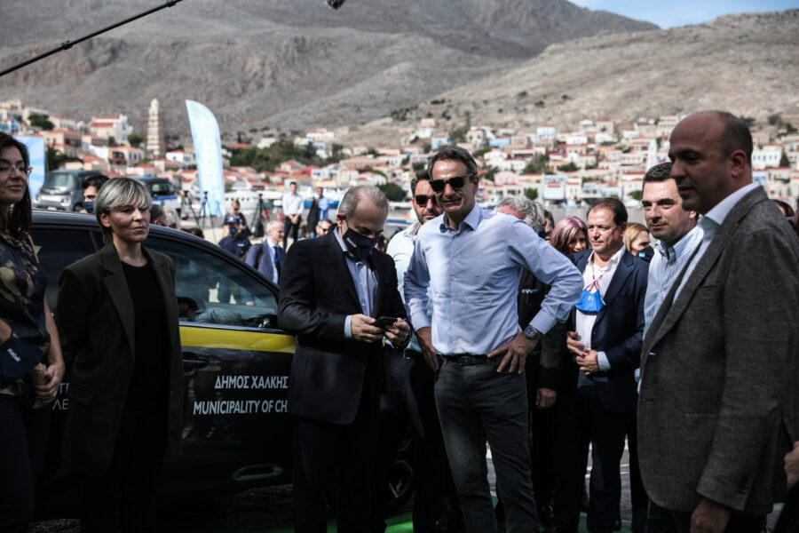 Πρώτος σταθμός του Πρωθυπουργού ήταν το Λιμεναρχείο της Χάλκης, όπου παρακολούθησε την παράδοση έξι ηλεκτρικών αυτοκινήτων, τέσσερα δωρεά της Citroën και δύο της ALD Automotive. Δύο από τα οχήματα είναι περιπολικά και δόθηκαν στην Αστυνομία και το Λιμενικό, ενώ δύο άλλα είναι αυτοκίνητα μεγάλης χωρητικότητας και δωρήθηκαν στο Δήμο για την εξυπηρέτηση των αναγκών της τοπικής κοινωνίας.