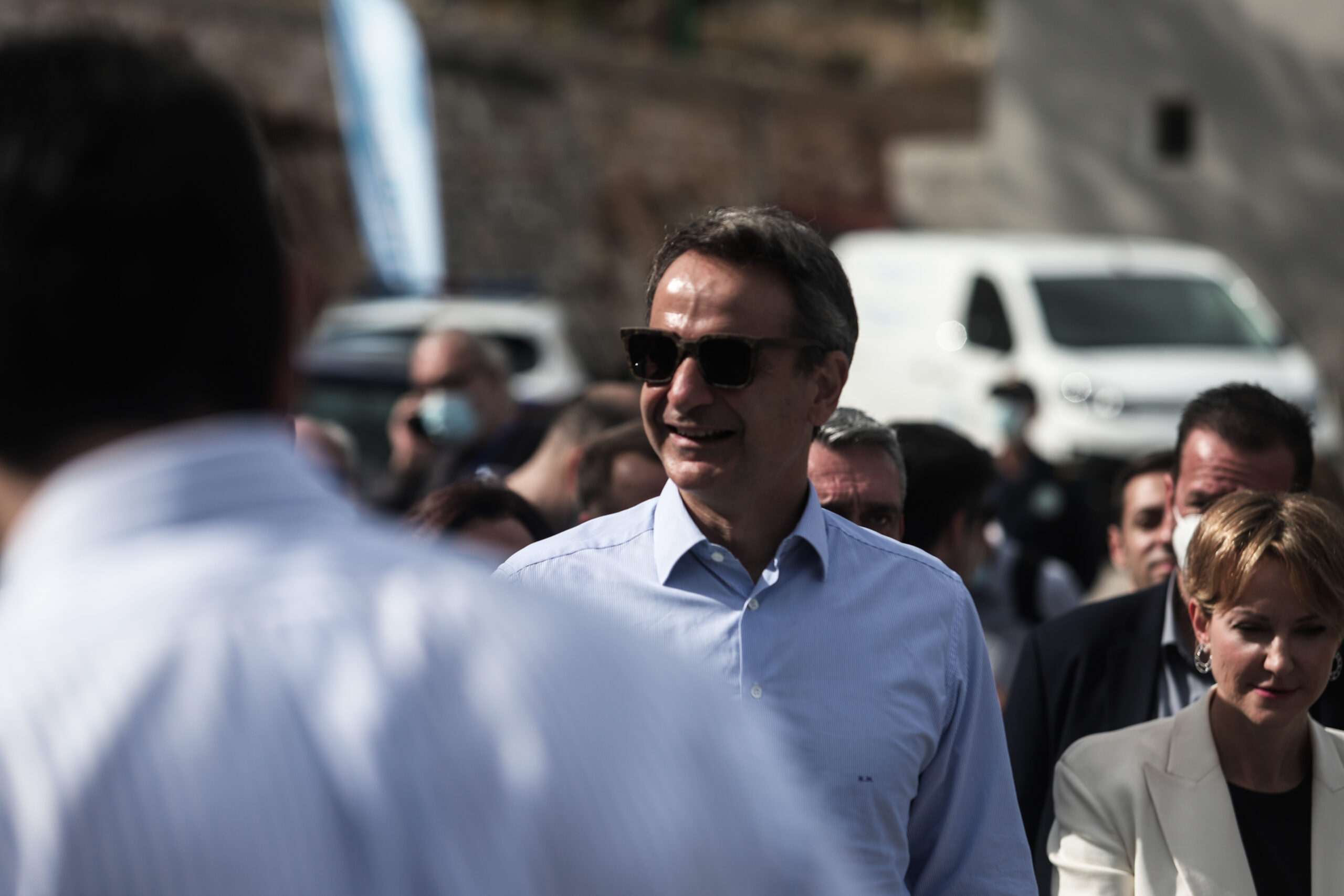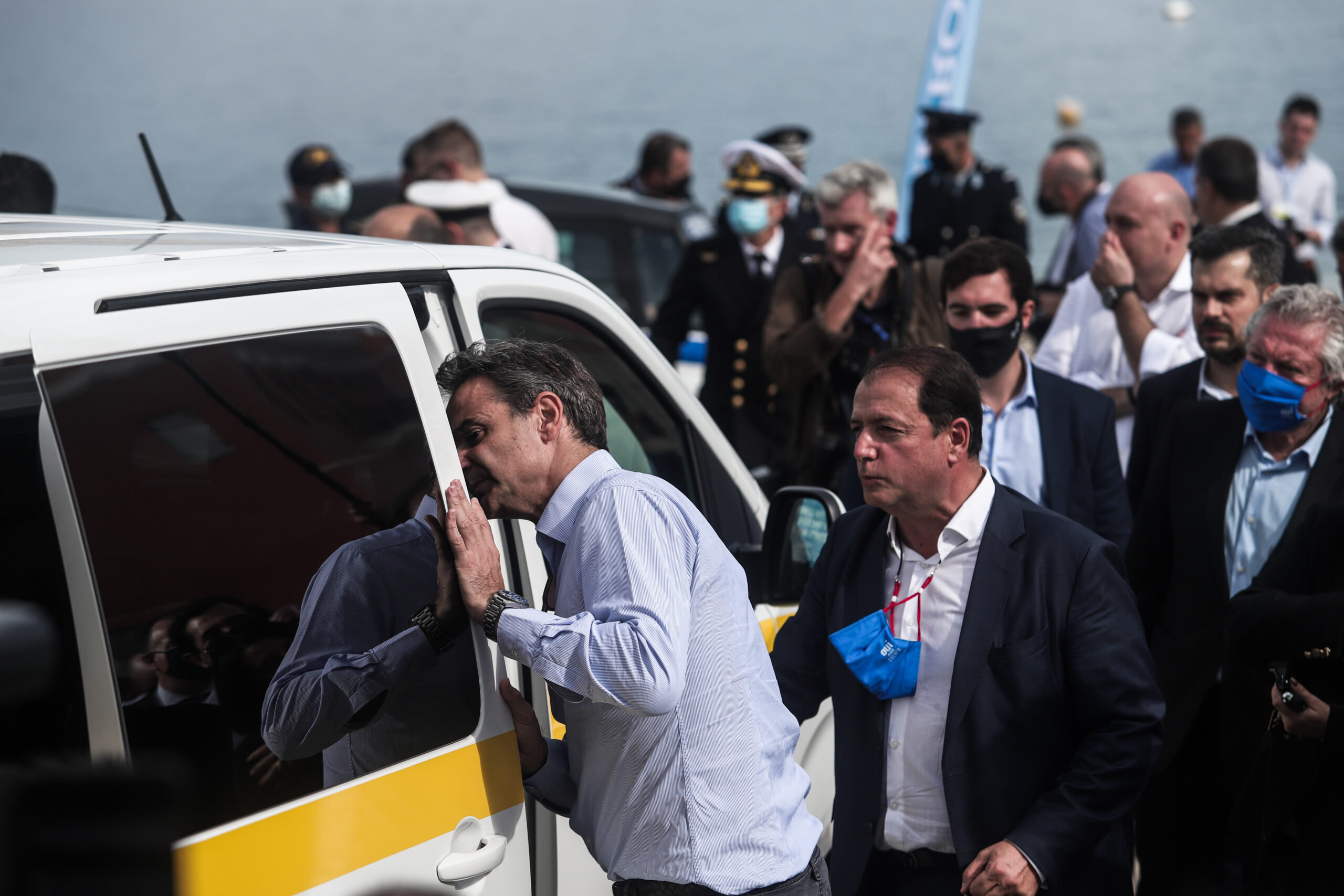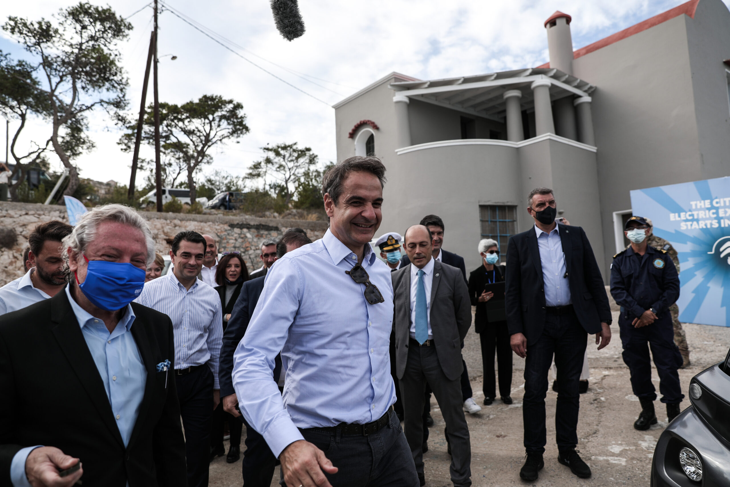 Πρώτος σταθμός του Πρωθυπουργού ήταν το Λιμεναρχείο της Χάλκης, όπου παρακολούθησε την παράδοση έξι ηλεκτρικών αυτοκινήτων, τέσσερα δωρεά της Citroën και δύο της ALD Automotive. Δύο από τα οχήματα είναι περιπολικά και δόθηκαν στην Αστυνομία και το Λιμενικό, ενώ δύο άλλα είναι αυτοκίνητα μεγάλης χωρητικότητας και δωρήθηκαν στο Δήμο για την εξυπηρέτηση των αναγκών της τοπικής κοινωνίας.