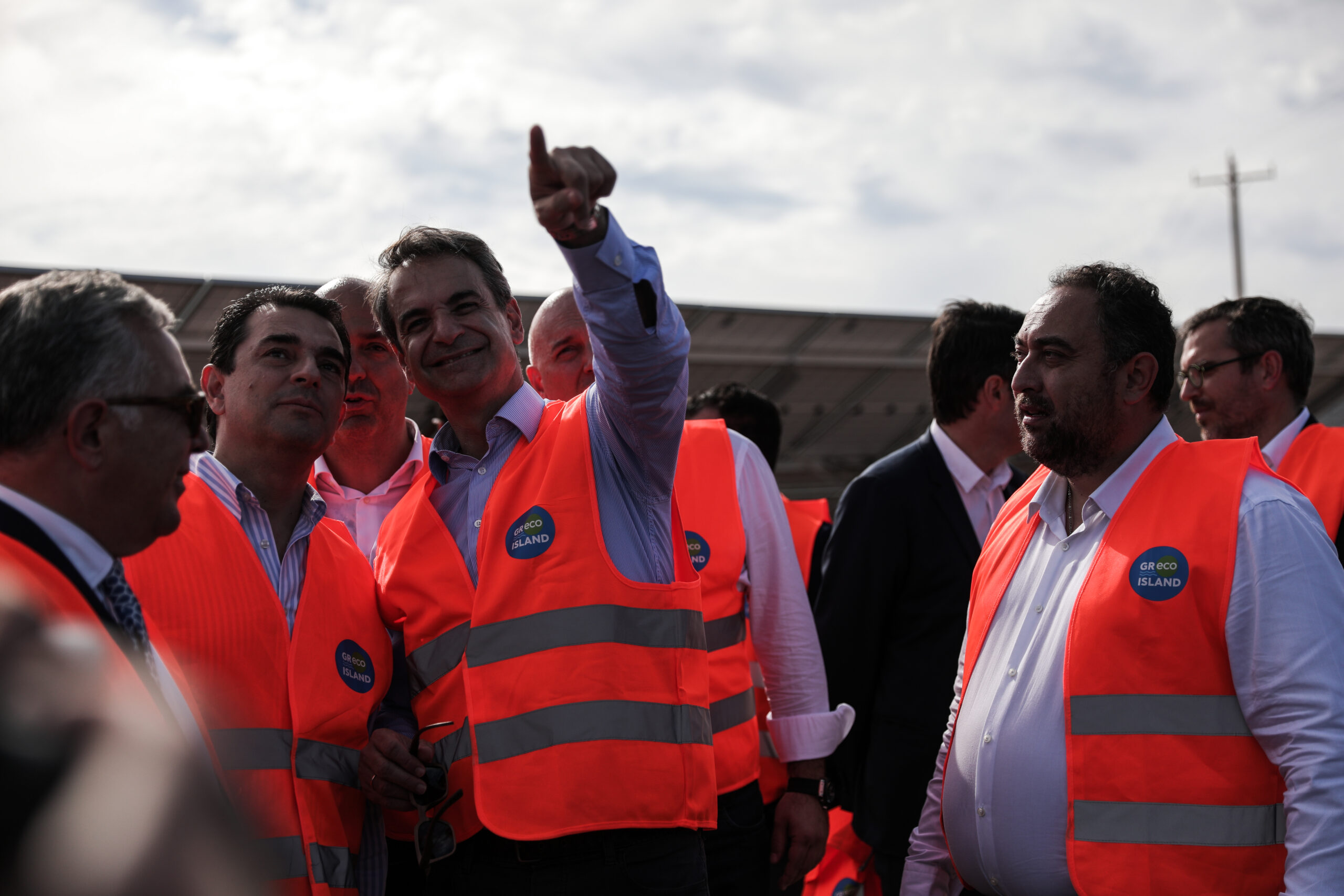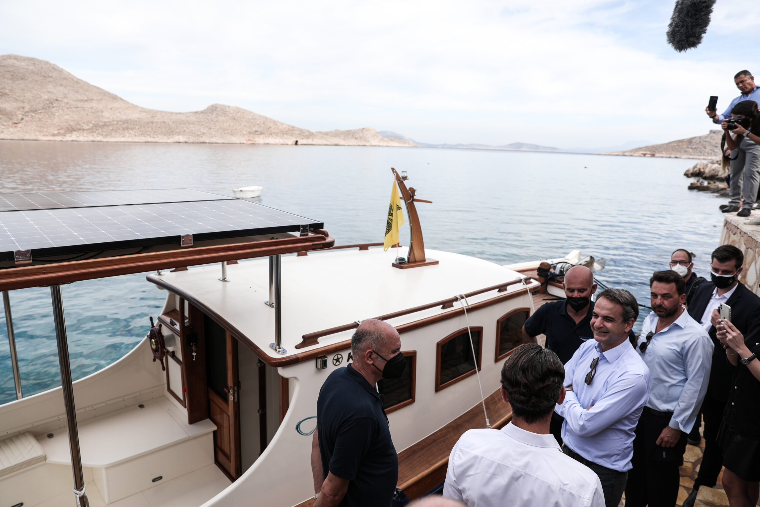 Ο Κυριάκος Μητσοτάκης έπλευσε με το e-πλοίο έως το σημείο όπου βρίσκεται το νέο φωτοβολταϊκό πάρκο του νησιού, ισχύος 1 MW, το οποίο κατασκευάστηκε χάρη στη συνεργασία των εταιρειών ΔΕΗ, AKUO Energy και OMEXOM (του ομίλου Vinci).