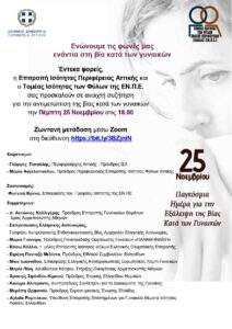 Την κεντρική διαδικτυακή εκδήλωση για την Παγκόσμια Ημέρα για την Εξάλειψη της Βίας κατά των Γυναικών, διοργανώνουν αύριο Πέμπτη 25 Νοεμβρίου στις 18.00 η Περιφέρεια Αττικής, το Γραφείο Ισότητας της ΕΝ.Π.Ε. και η Περιφερειακή Επιτροπή Ισότητας των Φύλων της Αττικής μαζί με έντεκα φορείς που δραστηριοποιούνται στο πεδίο.