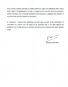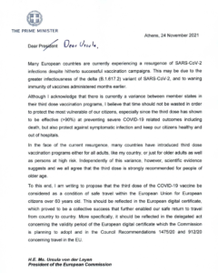 Ο πρωθυπουργός Κυριάκος Μητσοτάκης, έστειλε σήμερα, Τετάρτη (24/11) επιστολή στην πρόεδρο της Κομισιόν Ούρσουλα φον ντερ Λάιεν με την οποία προτείνει την 3η δόση του εμβολίου κατά του κορονοϊού ως προϋπόθεση ισχύος για τους άνω 60 προκειμένου να είναι σε ισχύ το πιστοποιητικό εμβολιασμού τους και να μπορούν να ταξιδέψουν εντός της Ε.Ε.