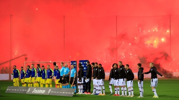 Οπαδοί του «Δικέφαλου» πέταξαν δεκάδες αντικείμενα, φωτοβολίδες και τελικά εισέβαλαν στον αγωνιστικό χώρο, με αποτέλεσμα τη διακοπή της συνάντησης.