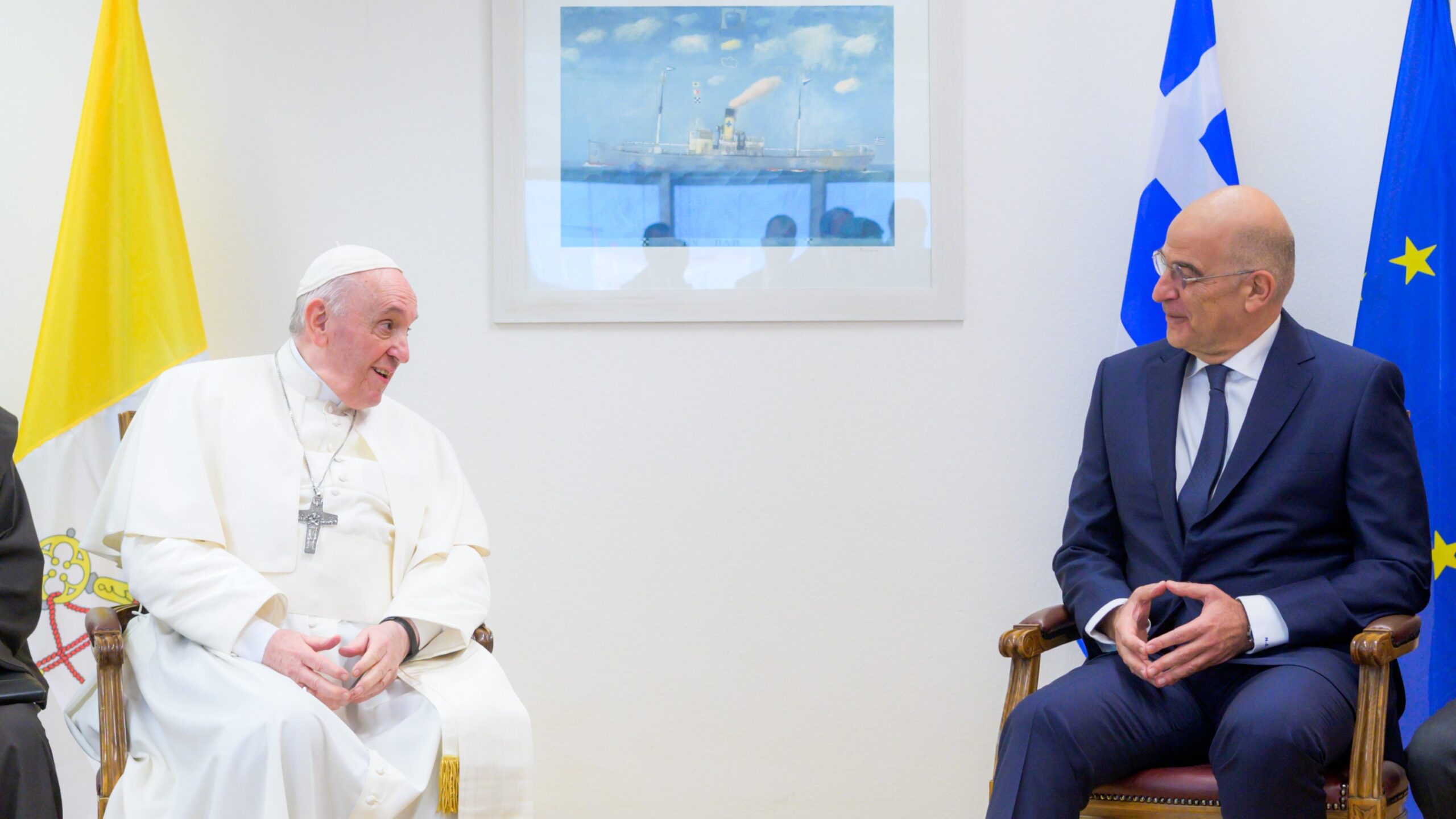 Μετά την υποδοχή του Ποντίφικα, ο Νίκος Δένδιας είχε στην αίθουσα VIP του αεροδρομίου σύντομη συνάντηση μαζί του, τη δεύτερη μετά την ακρόαση στο Βατικανό στις 23/10/2019, όπως επισημαίνεται σε ανάρτησή του στο Twitter.