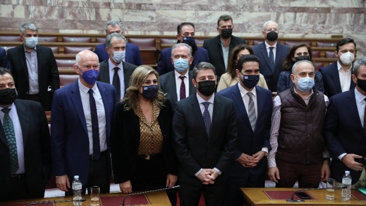 Ο κ. Ανδρουλάκης κατά την είσοδό του στην αίθουσα της Γερουσίας χαιρέτησε έναν έναν τους βουλευτές τού Κινήματος Αλλαγής και κάθισε δίπλα στον Γιώργο Παπανδρέου.