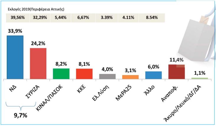 Σύμφωνα με την έρευνα, στο ερώτημα «αν την επόμενη Κυριακή είχαμε εθνικές εκλογές, ποιο κόμμα θα ψηφίζατε;» το 33,9% των ερωτηθέντων απαντά Νέα Δημοκρατία και το 24,2% λέει ΣΥΡΙΖΑ. Η ανοδική τάση του Κινήματος Αλλαγής επιβεβαιώνεται στη δημοσκόπηση, καθώς συγκεντρώνει το 8,2% των ερωτηθέντων, ποσοστό υψηλότερο του 5,44% που κατέγραψε στις εθνικές εκλογές στην Αττική.