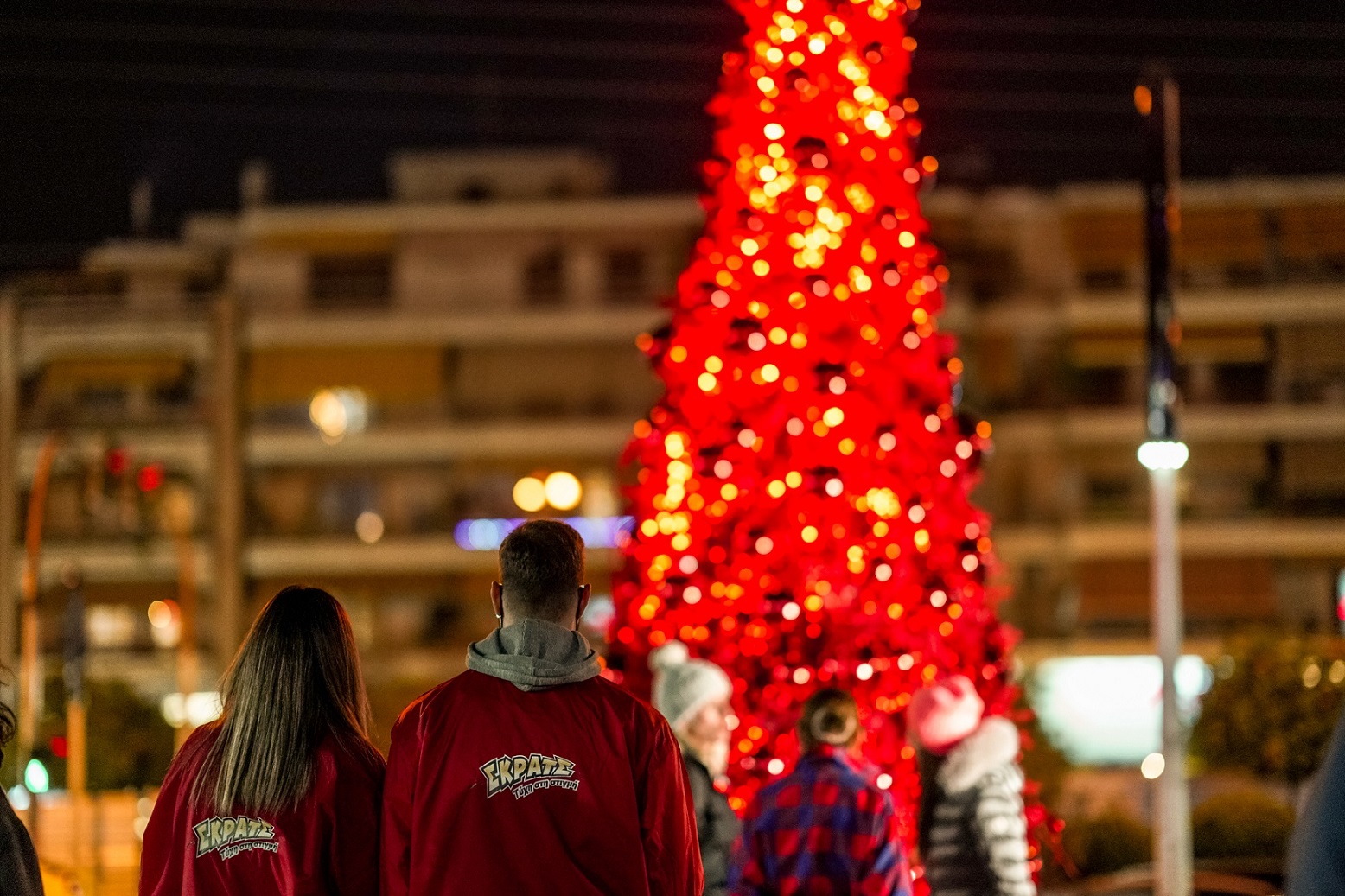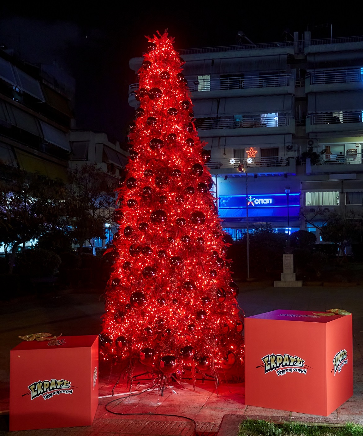 Το κατακόκκινο δέντρο του ΣΚΡΑΤΣ δημιουργεί ένα άκρως εορταστικό κλίμα στην πλατεία Μανδηλαρά, στο Γαλάτσι, και γεμίζει με χριστουγεννιάτικο χρώμα τις φωτογραφίες κατοίκων και επισκεπτών.