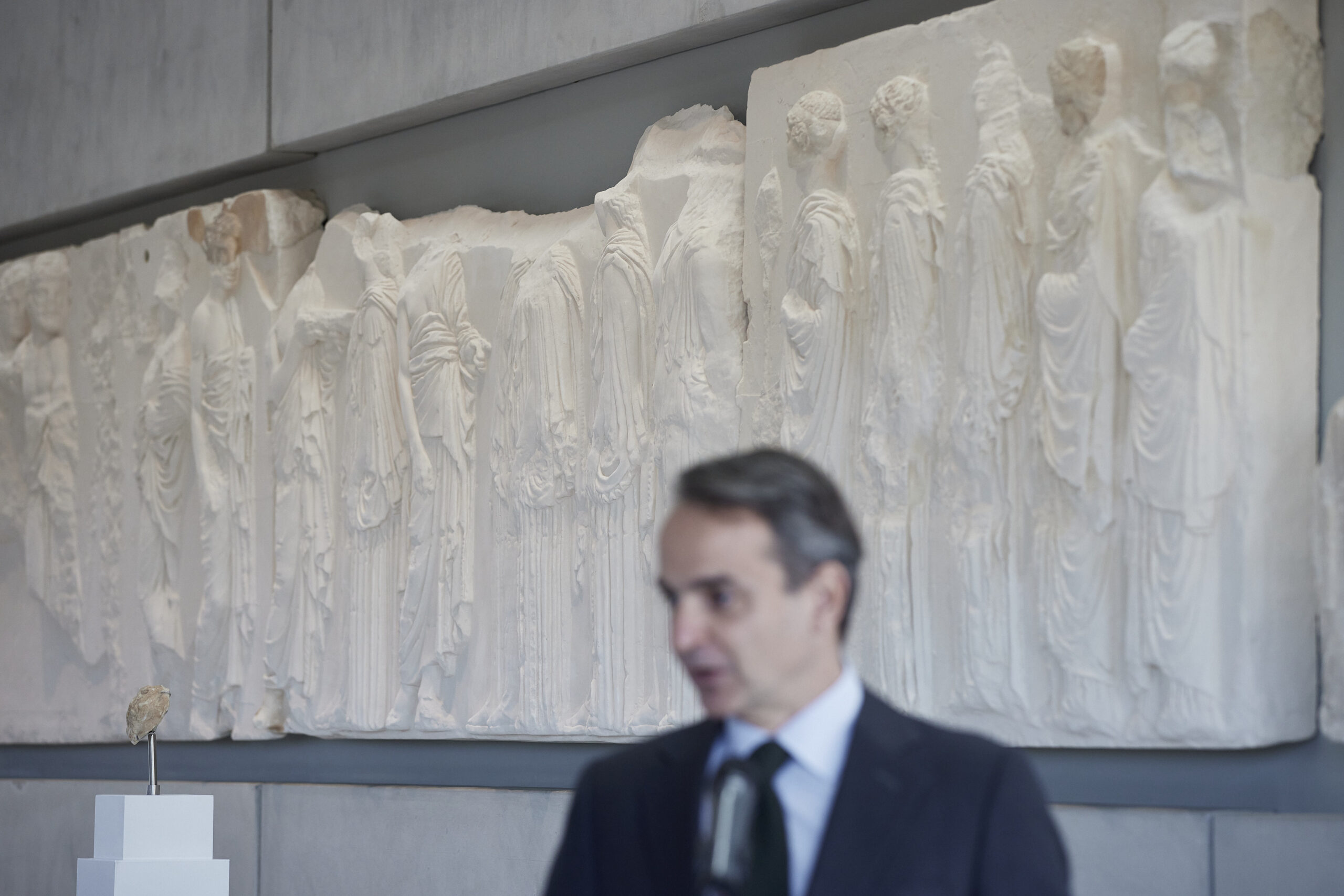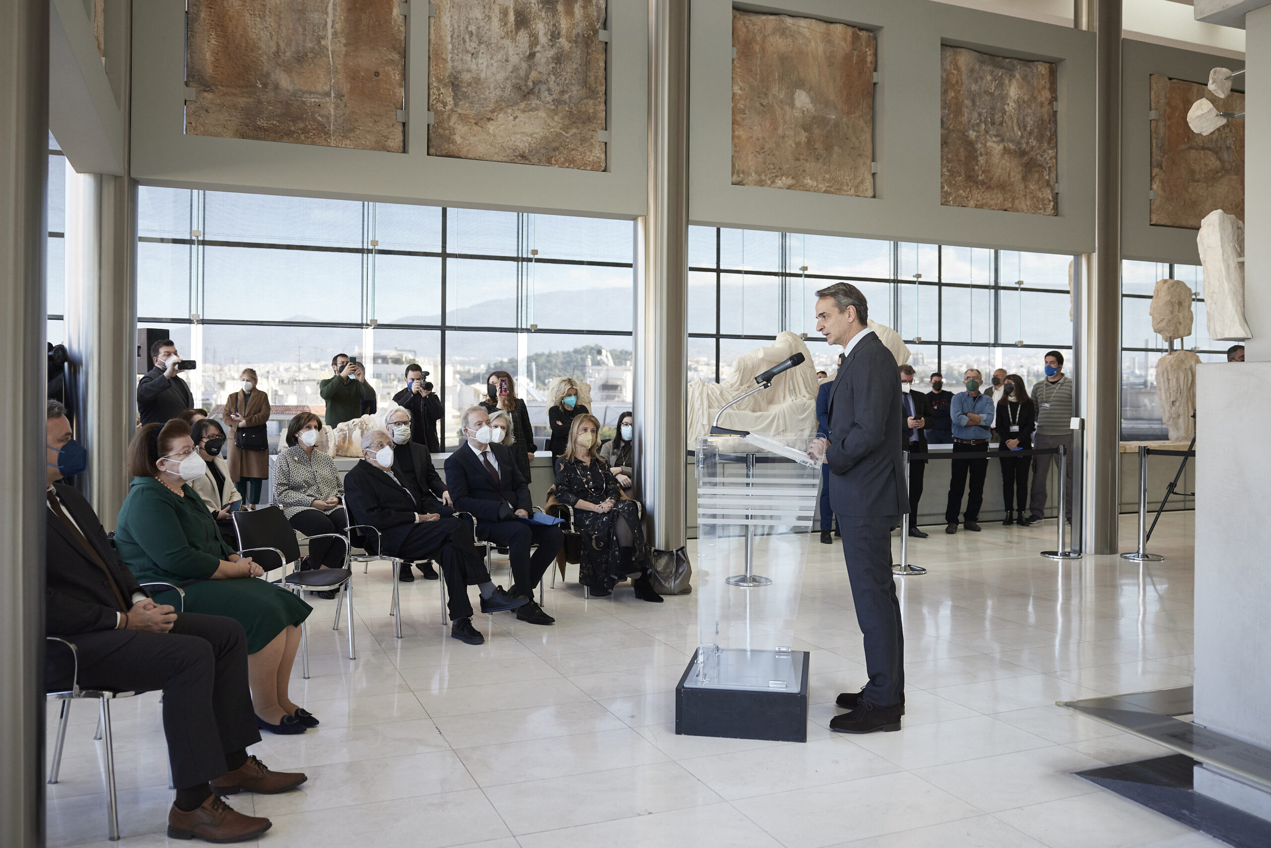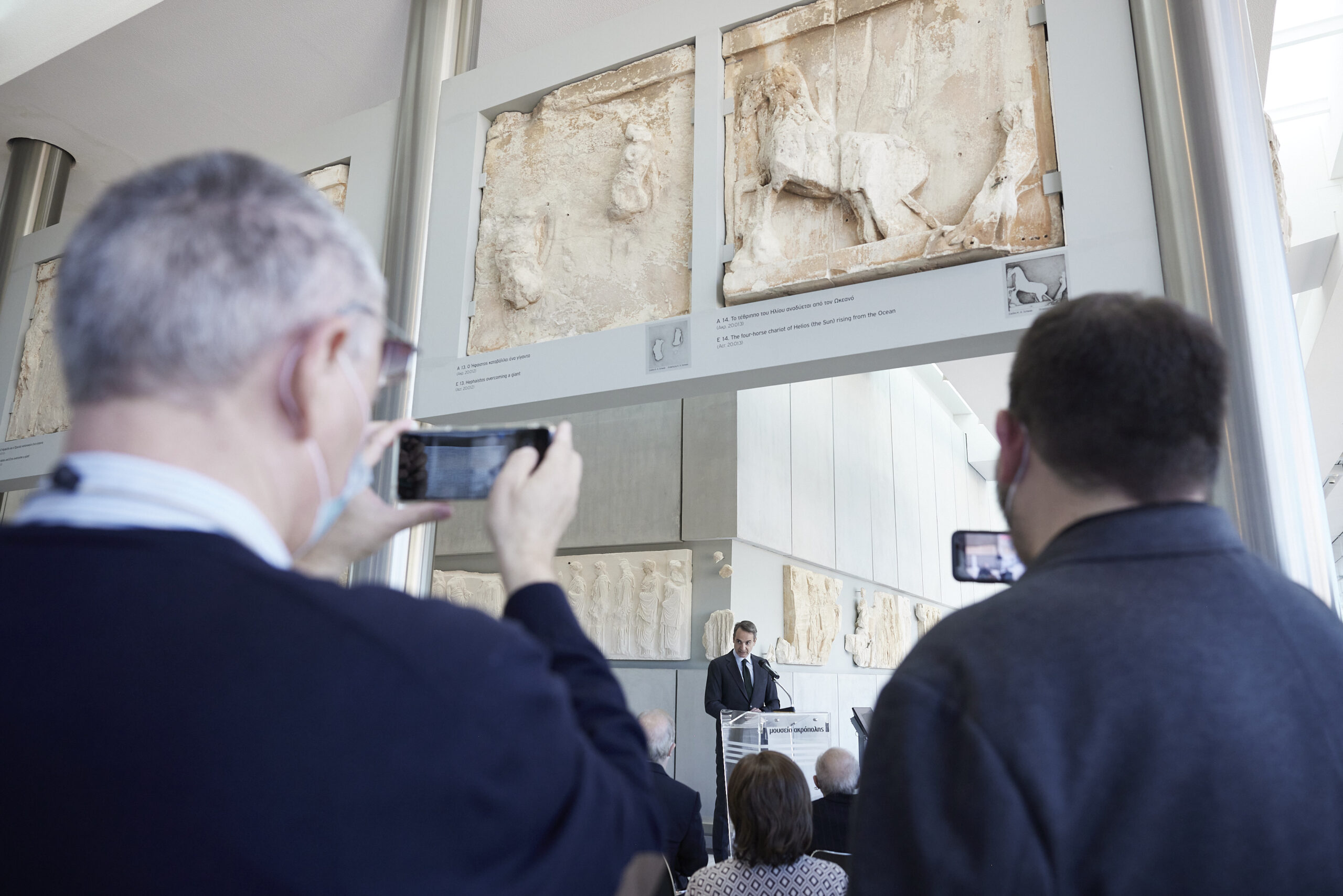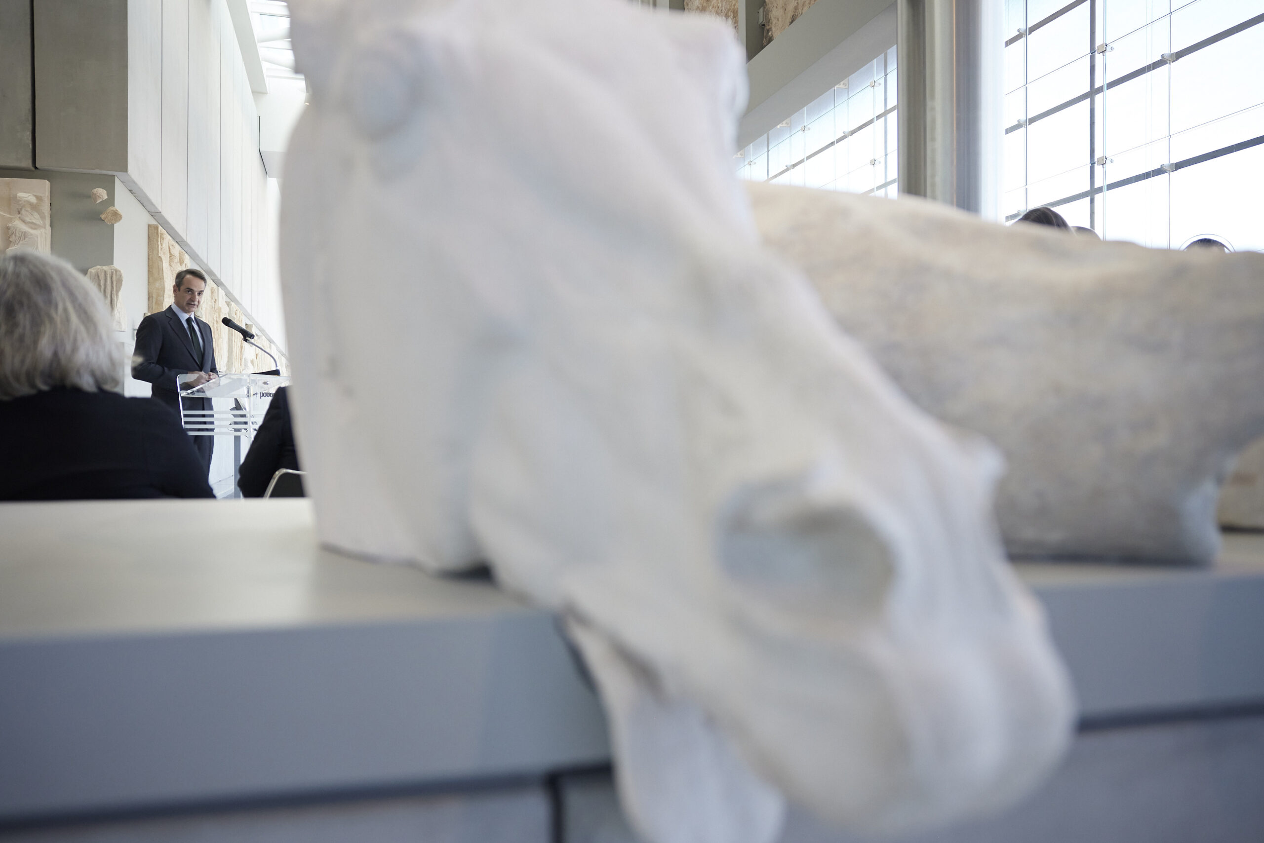 Μιλώντας στην αίθουσα του Παρθενώνα, ο Κυριάκος Μητσοτάκης υπογράμμισε ότι «είναι ένα πρώτο αλλά πολύ σημαντικό βήμα στην προσπάθεια να συγκεντρωθούν εδώ, στο Μουσείο της Ακρόπολης, όλα τα μικρότερα και μεγαλύτερα μέρη του διακόσμου του Παρθενώνα που βρίσκονται σήμερα διάσπαρτα σε διάφορα μουσεία ανά τον κόσμο».