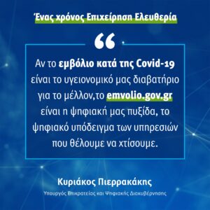 Ο υπουργός επισημαίνει ότι «αυτή τη στιγμή έχουν πραγματοποιηθεί περισσότερα από 17.900.000 ραντεβού για εμβολιασμό. Πάνω από το 80% του ενήλικου πληθυσμού είναι πλέον καλυμμένο έστω και μερικώς, ενώ παράλληλα σχεδόν 4 εκατομμύρια συμπολίτες μας έχουν ήδη κάνει την αναμνηστική τους δόση. Σήμερα, μπορούμε με βεβαιότητα να πούμε πως η Ελλάδα κατάφερε να οικοδομήσει ένα ψηφιακό σύστημα διαχείρισης του εμβολίου, όταν άλλες μεγάλες χώρες απέτυχαν. Αυτό που όμως πραγματικά κρατάμε από αυτή τη μεγάλη επιχείρηση είναι τα διδάγματα της προσπάθειας και της προσήλωσης σε ένα στόχο: να σχεδιάζουμε συστήματα με επίκεντρο τον πολίτη και τις ανάγκες του, να αναγνωρίζουμε και να διορθώνουμε γρήγορα τις αστοχίες, να δημιουργούμε διεπιστημονικές ομάδες και να δουλεύουμε συνεργατικά, να επαναξιολογούμε συνεχώς τις μεθόδους μας. Αν το εμβόλιο κατά της COVID-19 είναι το υγειονομικό μας διαβατήριο για το μέλλον, το emvolio.gov.gr είναι η ψηφιακή μας πυξίδα, το ψηφιακό υπόδειγμα των υπηρεσιών που θέλουμε να χτίσουμε».