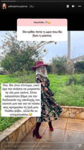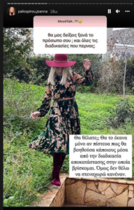 Άλλη follower τη ρώτησε αν θα δείξει ξανά το πρόσωπό της και τις διαδικασίες που περνάει και η Ιωάννα Παλιοσπύρου απάντησε: «Θα θέλατε; Θα το έκανα μόνο αν πίστευα ότι θα βοηθούσα κάποιους μέσα από τη διαδικασία αποκατάστασης στην οποία βρίσκομαι. Όμως δεν θέλω να στενοχωρώ κανέναν».