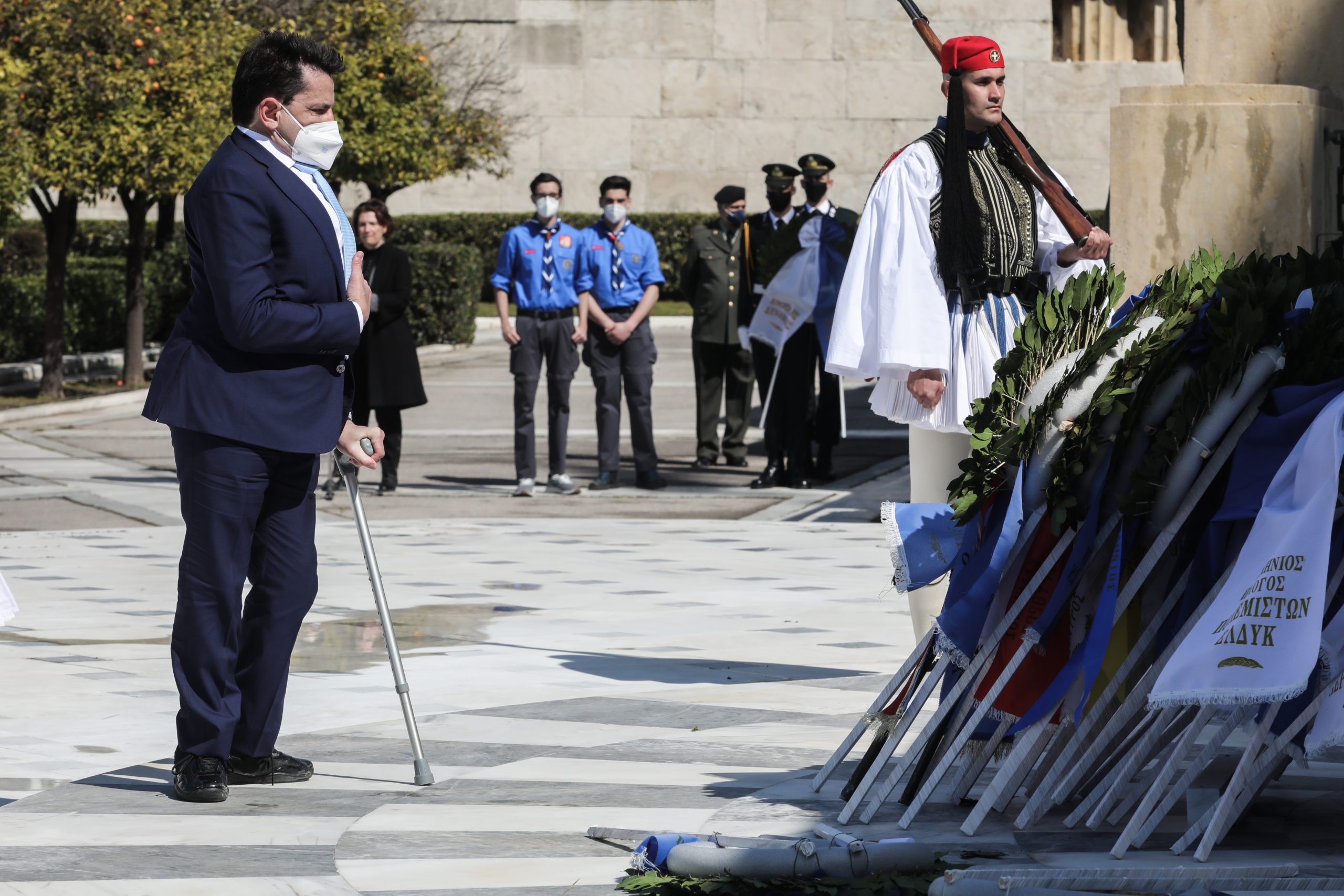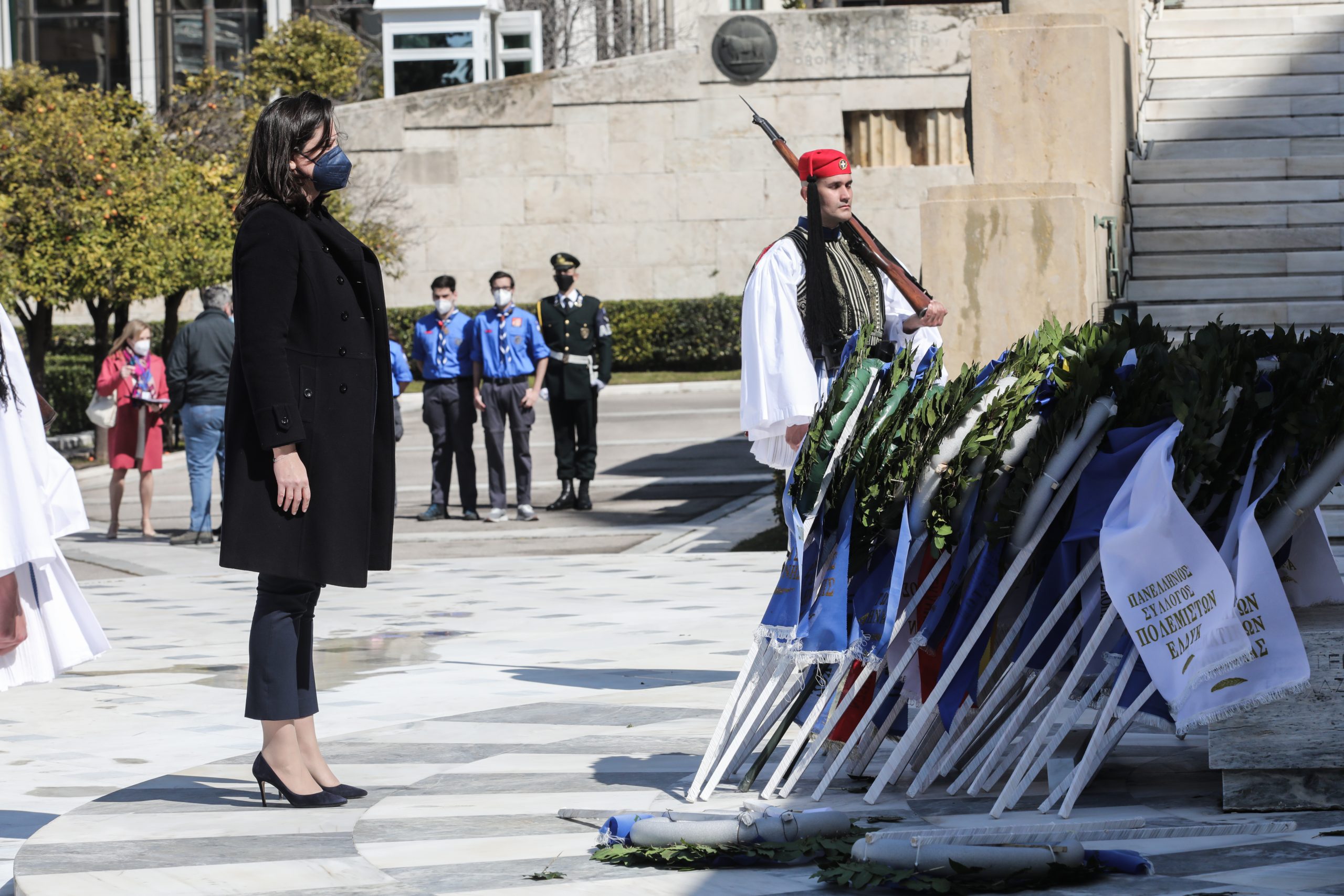 Της παρέλασης προηγήθηκε κατάθεση στεφάνων στο μνημείο του Αγνώστου Στρατιώτη από την υπουργό Παιδείας, Νίκη Κεραμέως, τον δήμαρχο Αθηναίων, Κώστα Μπακογιάννη, τον υπαρχηγό ΓΕΕΘΑ, αντιναύαρχο Ιωάννης Δρυμούση και την βουλευτή τηςς ΝΔ, Άννα Καραμανλή.