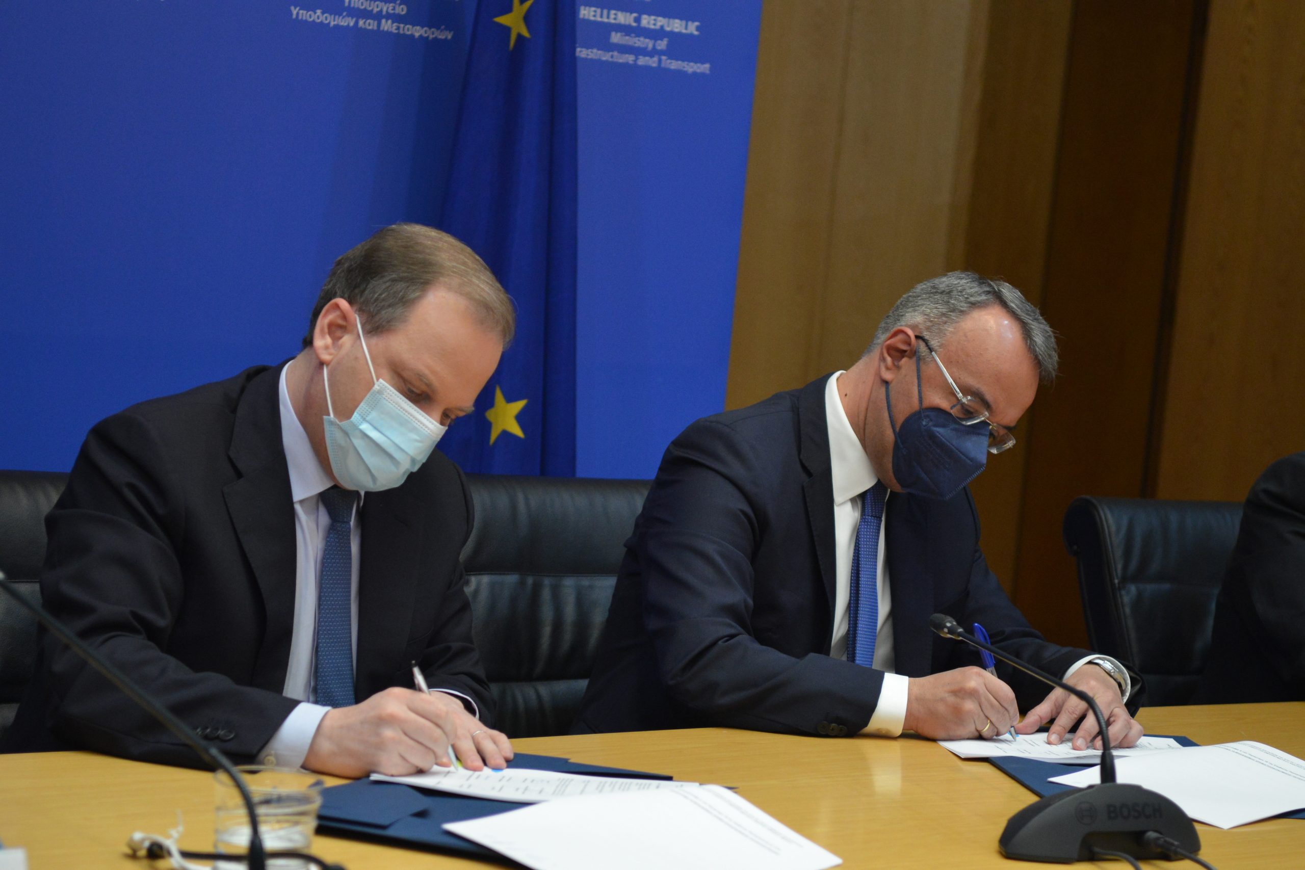 Υπεγράφη η τροποποίηση της σύμβασης παραχώρησης για την ανάπτυξη Εμπορευματικού και Διαμετακομιστικού Κέντρου στο Θριάσιο, δηλαδή του πρώτου Logistics Park στην Ελλάδα, από τον Υπουργό Υποδομών και Μεταφορών, κ. Κώστα Καραμανλή και τον Υπουργό Οικονομικών, κ. Χρήστο Σταϊκούρα.