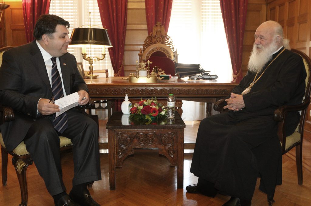 Τον αρχιεπίσκοπο Αθηνών και πάσης Ελλάδος Ιερώνυμο επισκέφθηκε σήμερα το μεσημέρι ο νέος πρέσβης των Ηνωμένων Πολιτειών Αμερικής στην Ελλάδα, Τζορτζ Τσούνης.